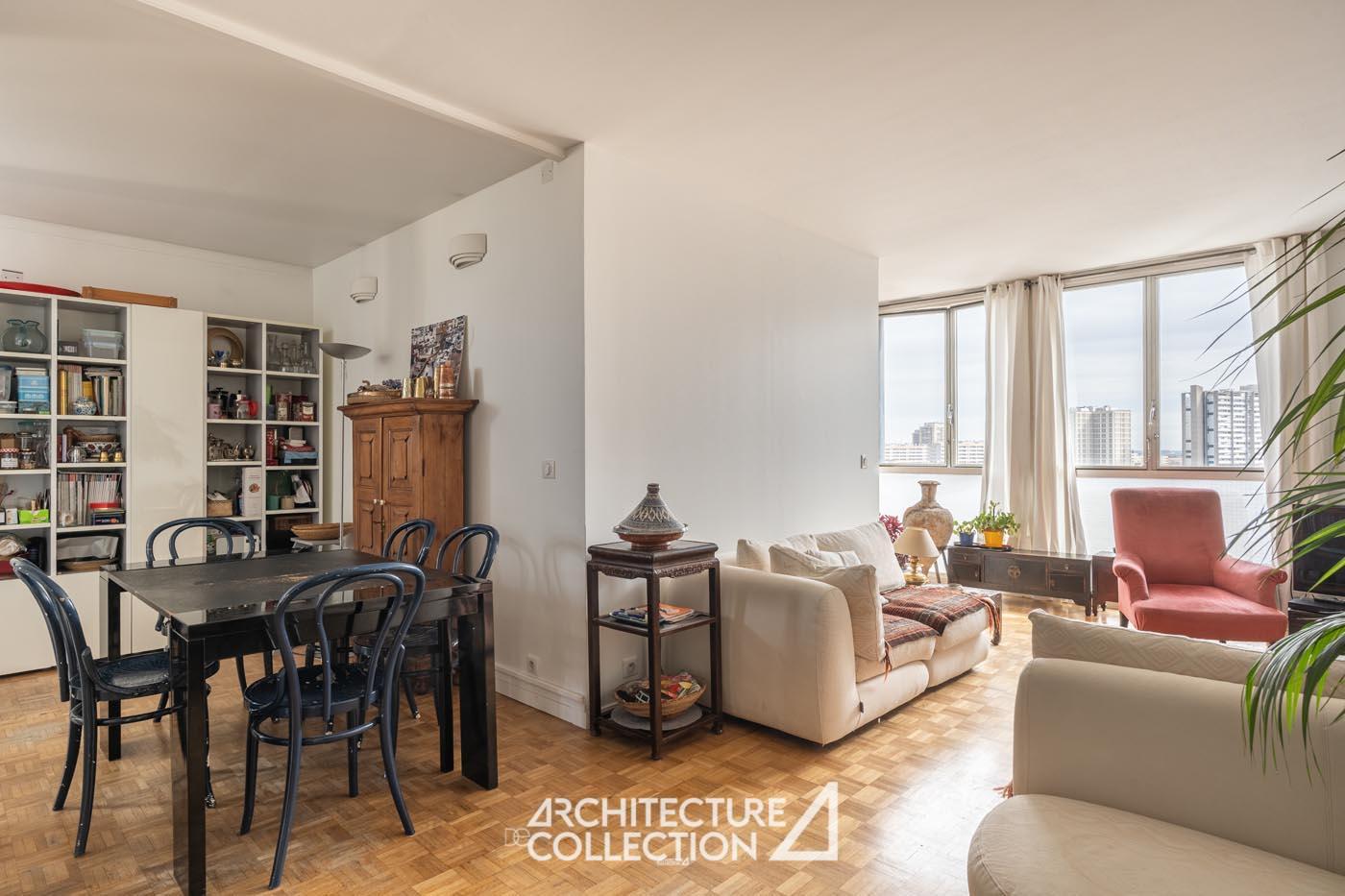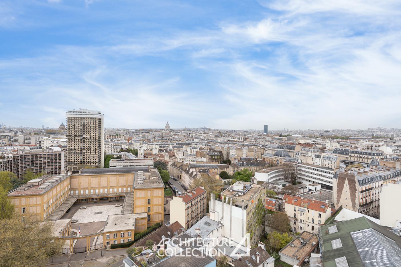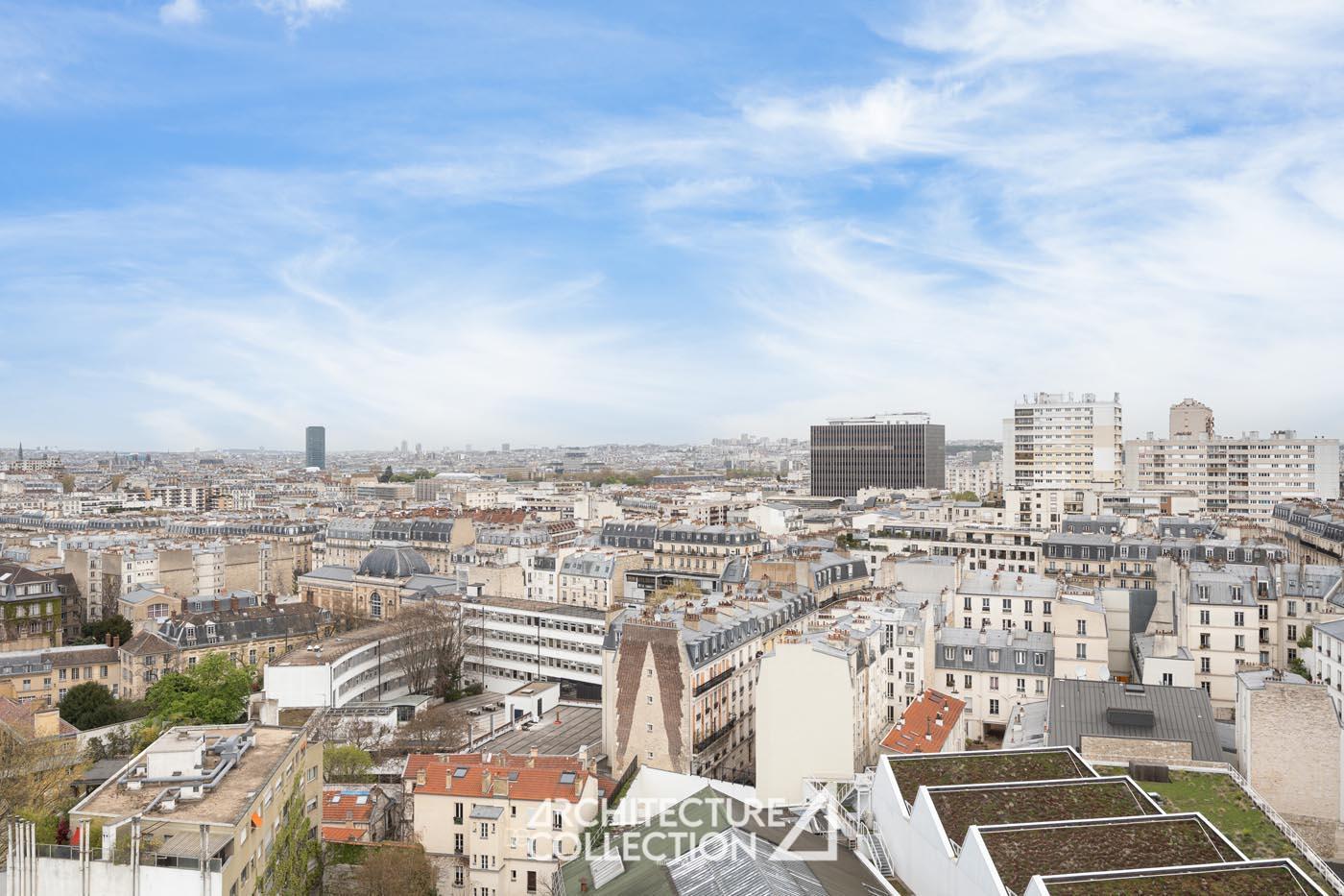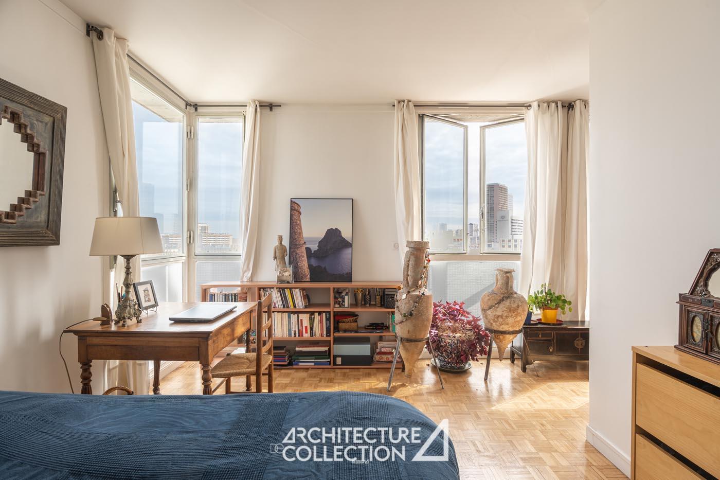 Bathed in light and transparency, the apartment benefits from a northeast and southwest exposure and numerous full-height windows. These provide breathtaking views of Paris and its landmarks, including Sacré-Cœur, Notre-Dame Cathedral, the Panthéon, Place d’Italie, and the towers of the 13th arrondissement.