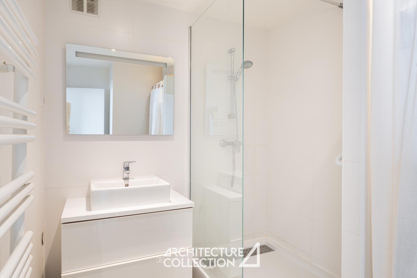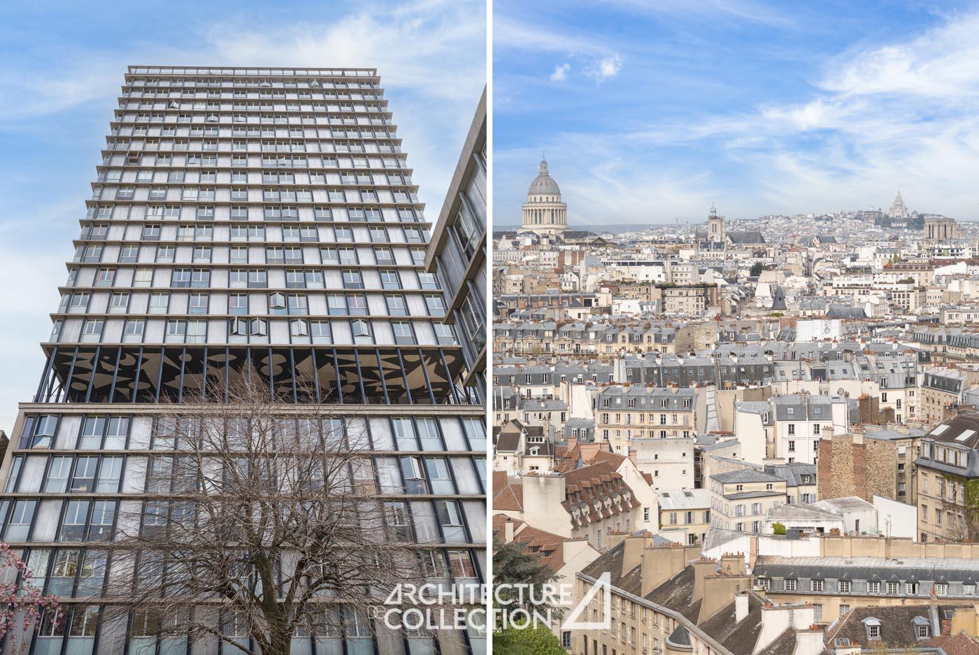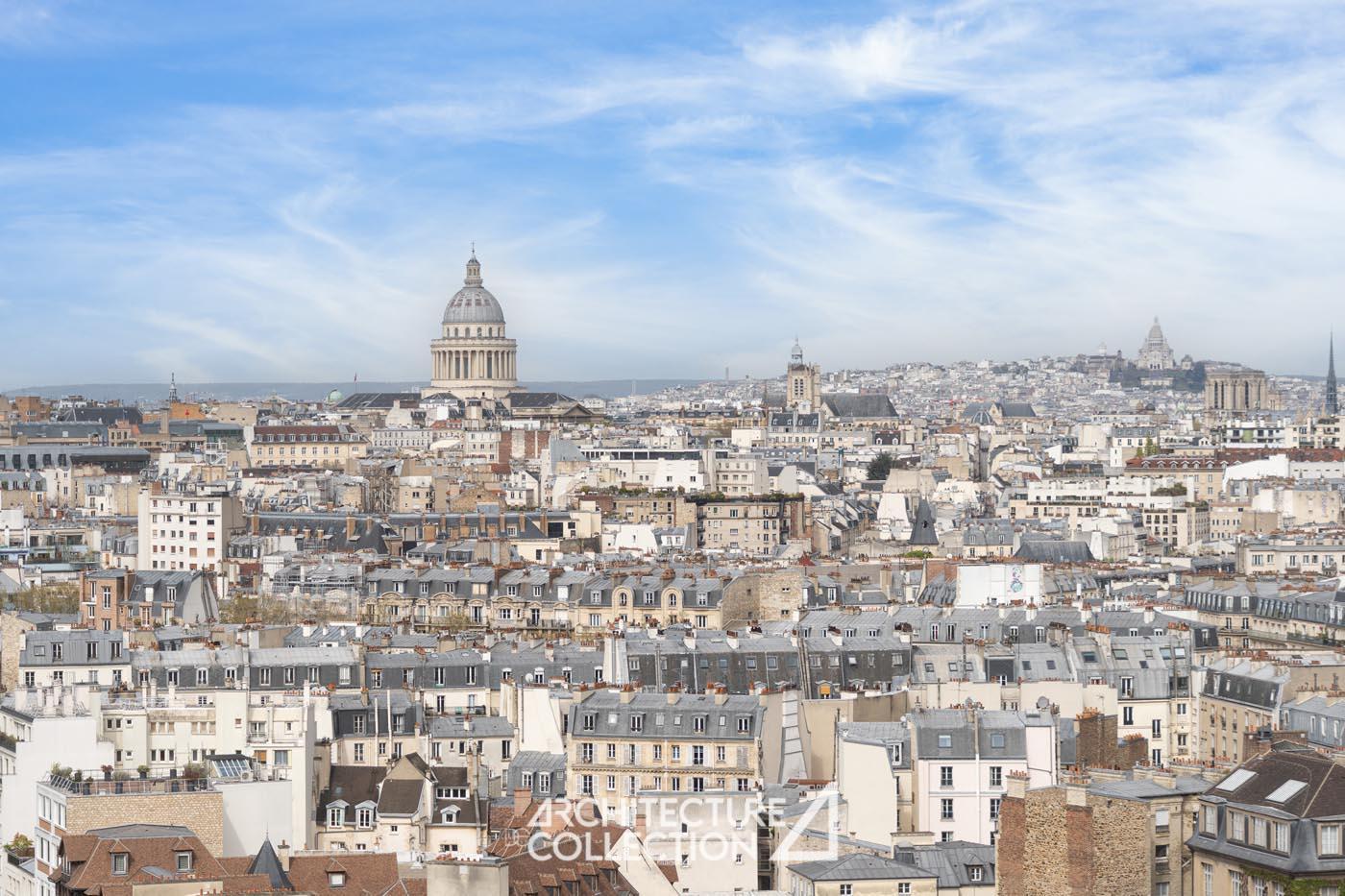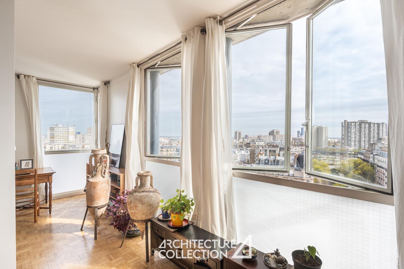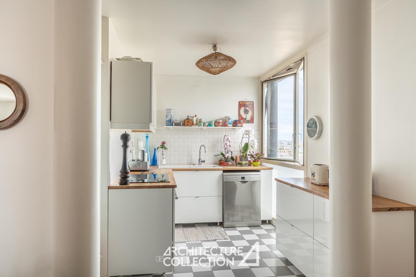 Bathed in light and transparency, the apartment benefits from a northeast and southwest exposure and numerous full-height windows. These provide breathtaking views of Paris and its landmarks, including Sacré-Cœur, Notre-Dame Cathedral, the Panthéon, Place d’Italie, and the towers of the 13th arrondissement.