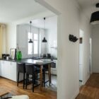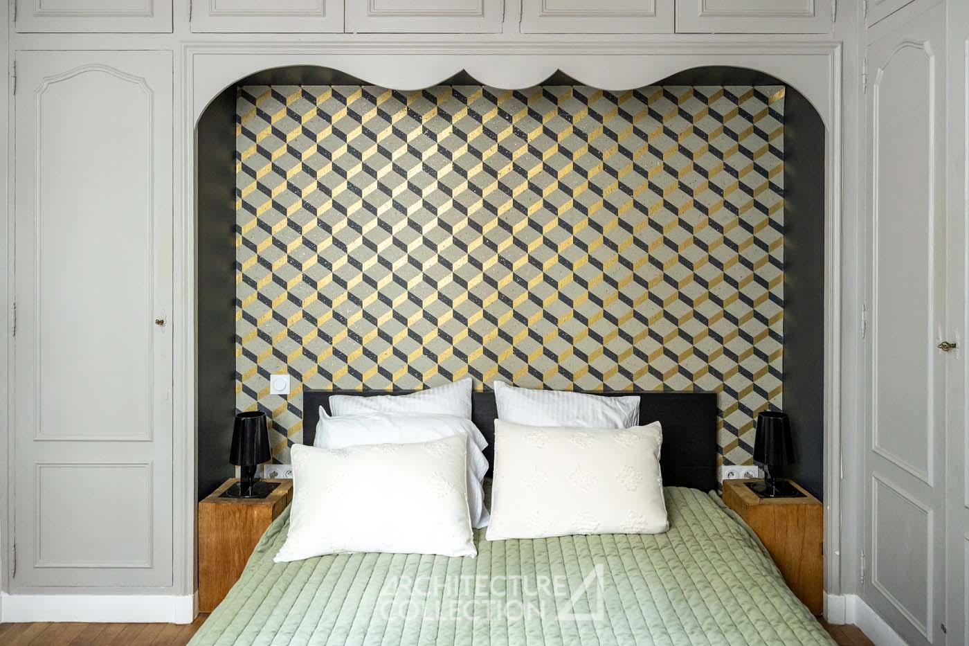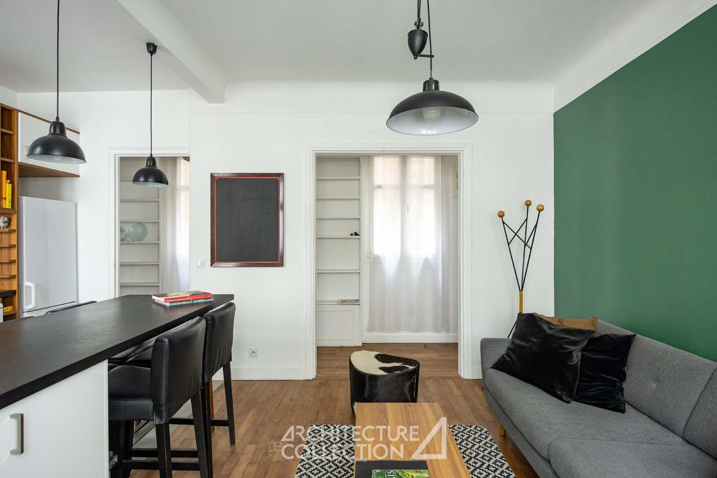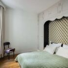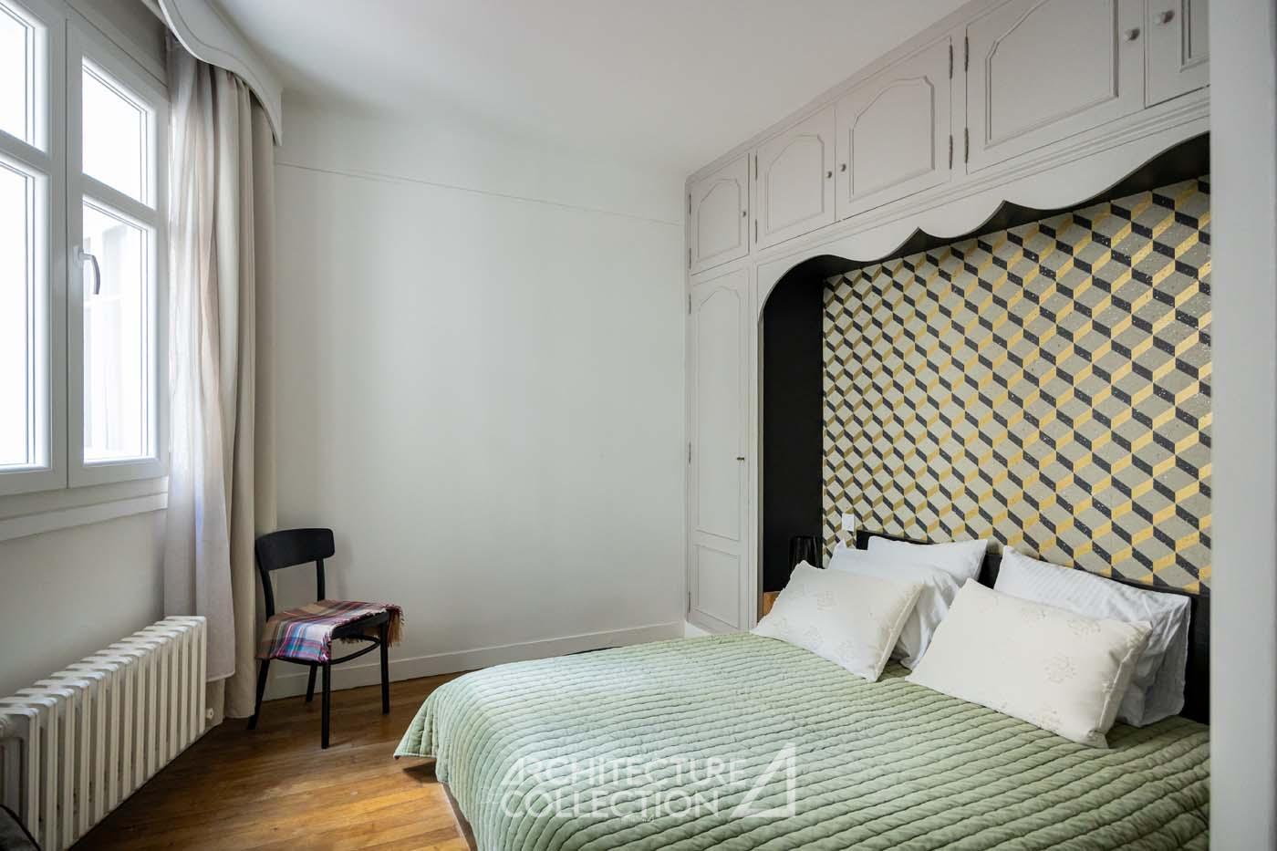 The apartment’s renovation in 2014 offers a contemporary reinterpretation of its original features. Historic details blend seamlessly with modern amenities, such as radiator covers integrated into the living room cabinets. In the bedroom, the bed set into an alcove continues this dialogue.