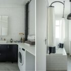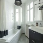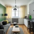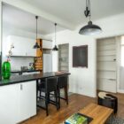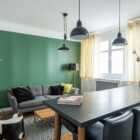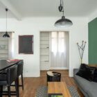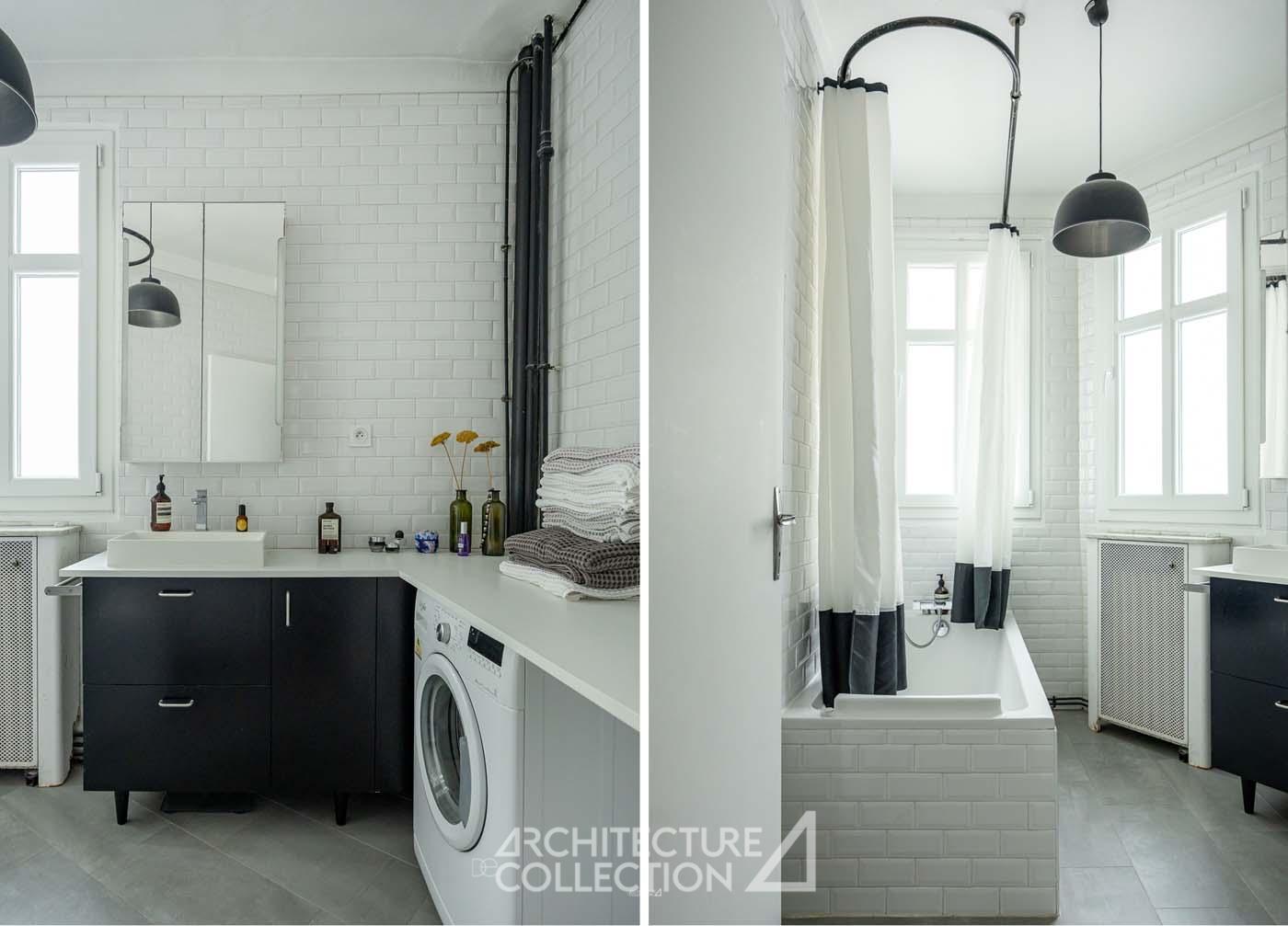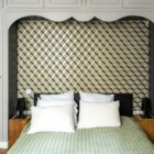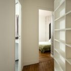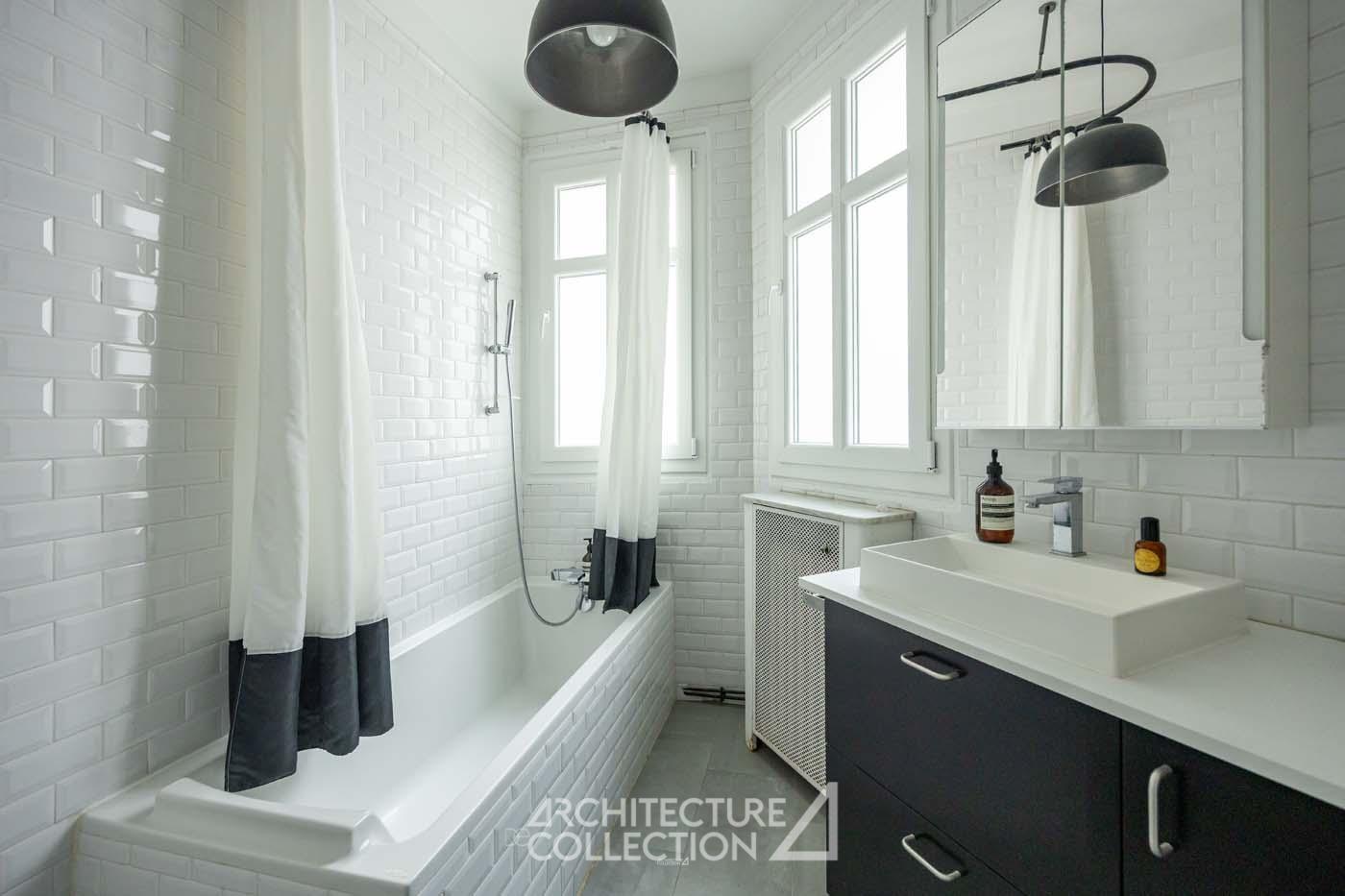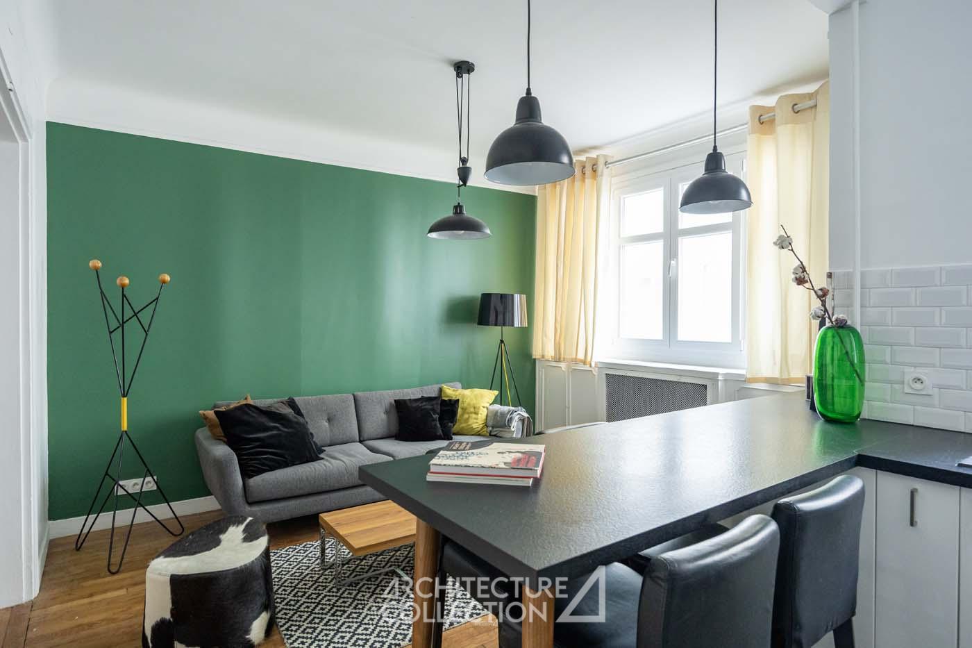 The apartment’s renovation in 2014 offers a contemporary reinterpretation of its original features. Historic details blend seamlessly with modern amenities, such as radiator covers integrated into the living room cabinets. In the bedroom, the bed set into an alcove continues this dialogue.