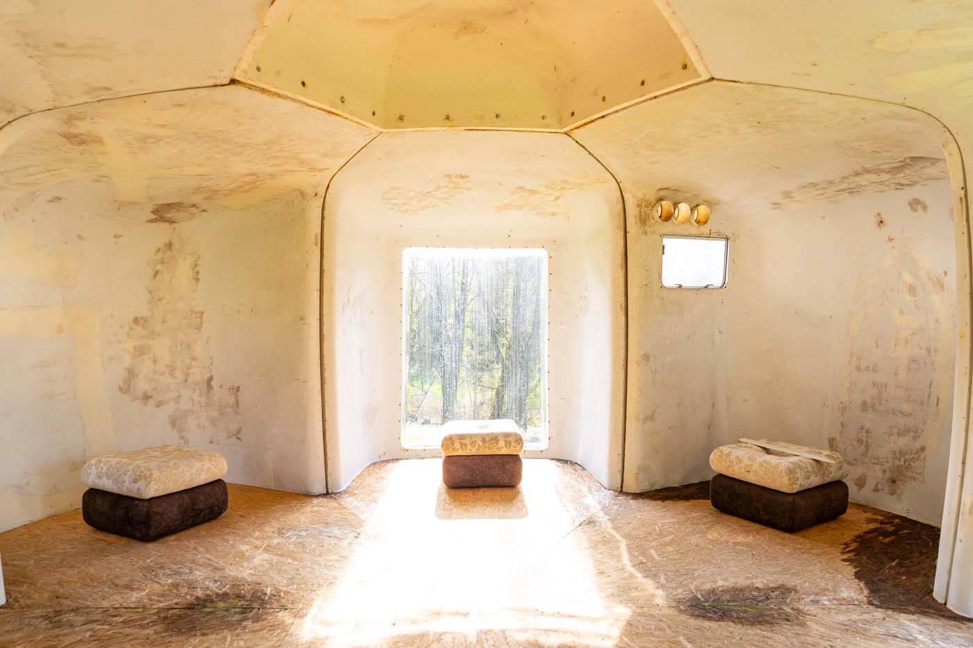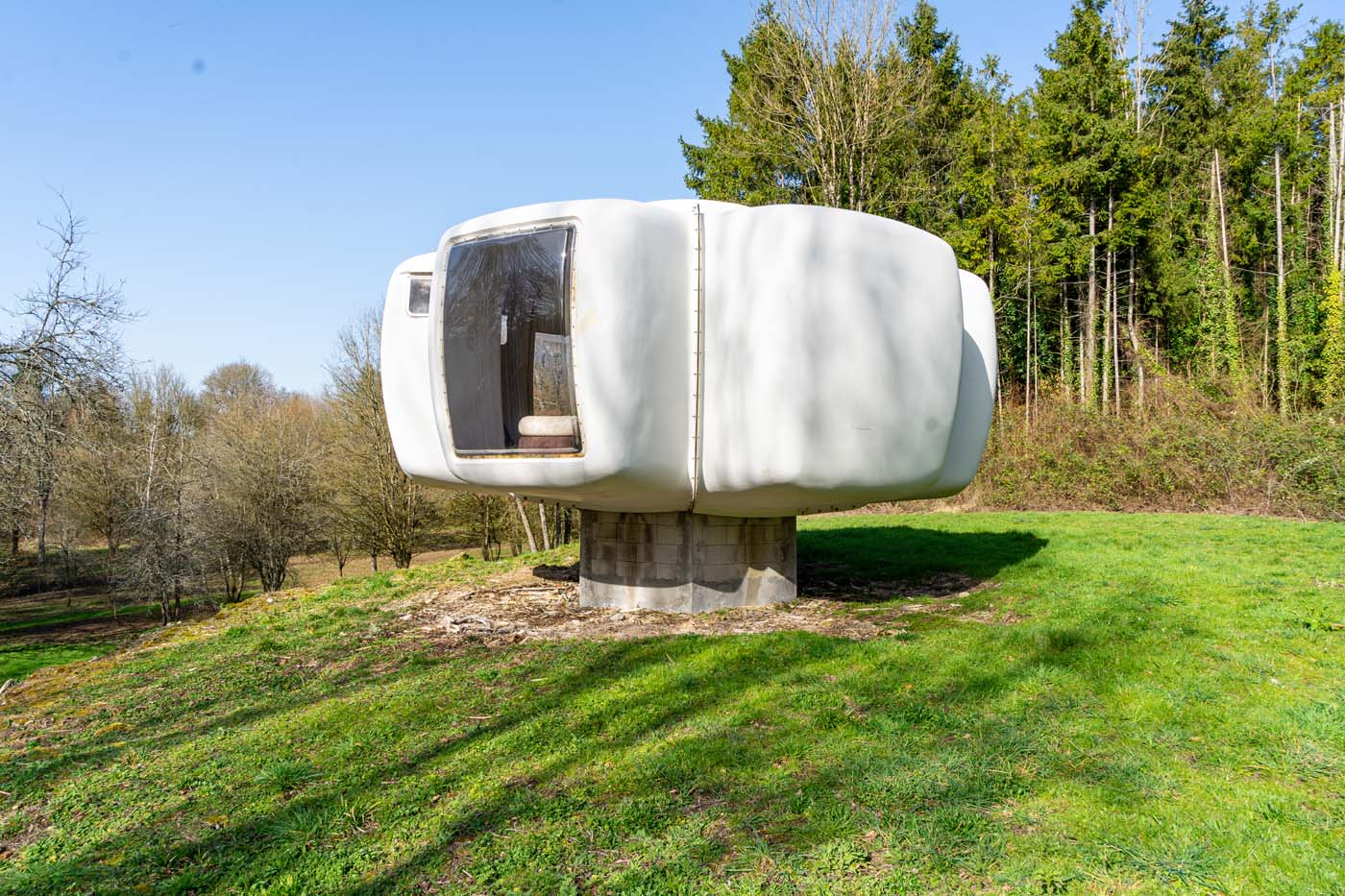 Making full use of the possibilities offered by the material, he designed a cellular and rational habitat. Born from the assembly of six polyester shells with bold curves and sometimes vivid colors, this “bulb” sits on a concrete base. Each protrusion is assigned a specific function, originally defined by perfectly integrated furniture and the most modern equipment.