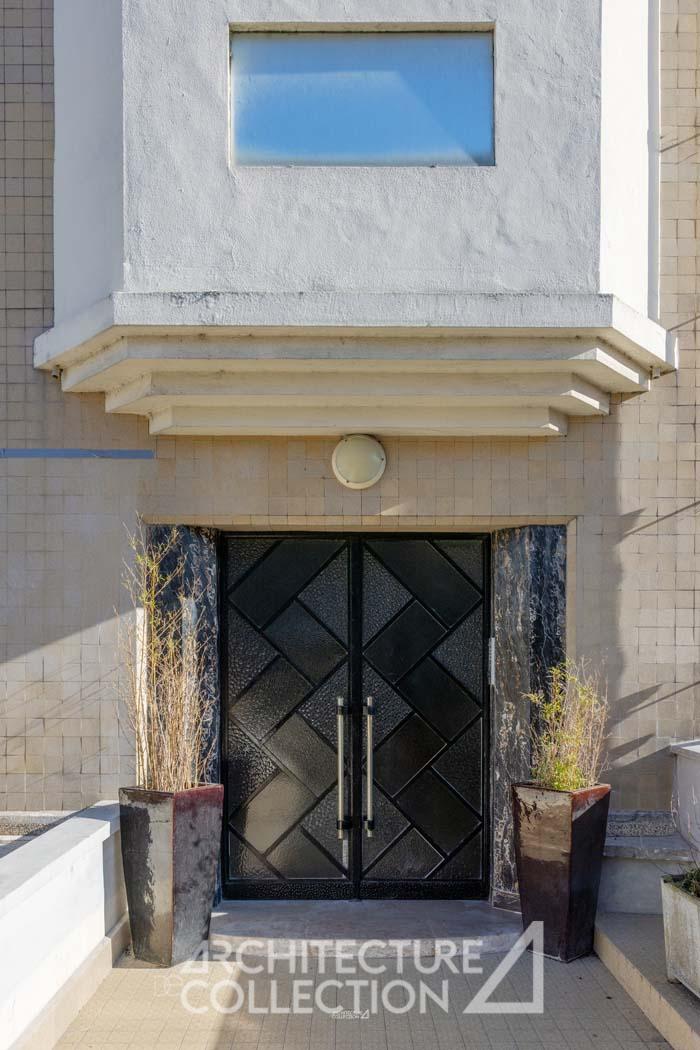 The garden façade of the building, clad in traditional light stone, is punctuated by double-height studio windows and rectangular projecting balconies adorned with geometric wrought-iron balustrades. The overall design reflects the period’s typical style, characterized by a strong orthogonality, embodied by the vertical projection of a central bay window and the horizontal line of a continuous balcony at the top of the structure. The bay window’s design aligns with the work of architects of the time, such as Michel Roux-Spitz, who modernized this motif by geometrizing its form.