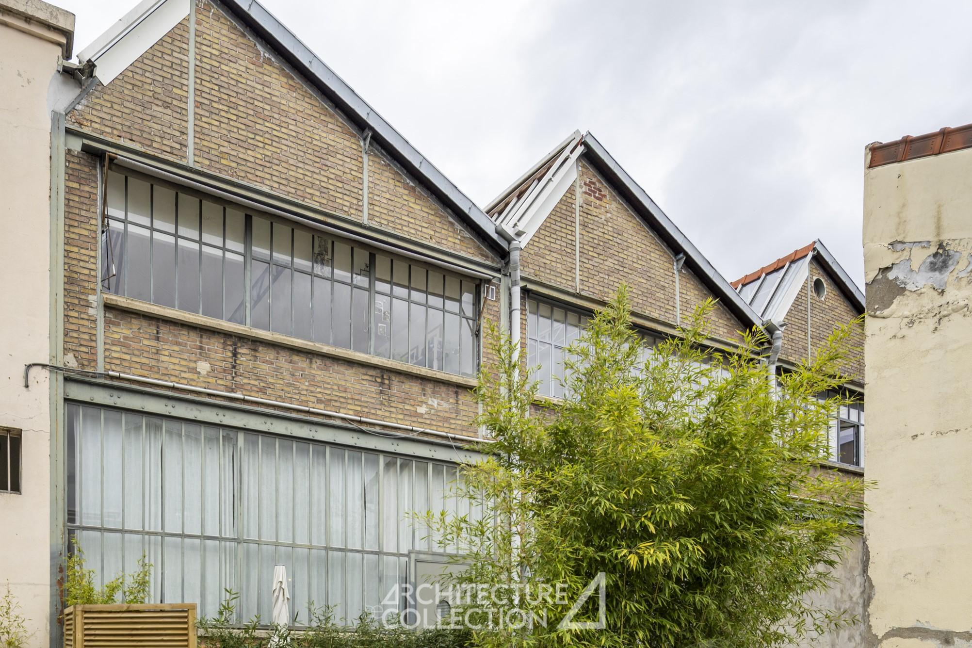 On the ground floor, the entrance opens onto a beautiful double-height office space, and leads to a large workshop at the rear. This level benefits from a small planted outdoor area in front of the building.