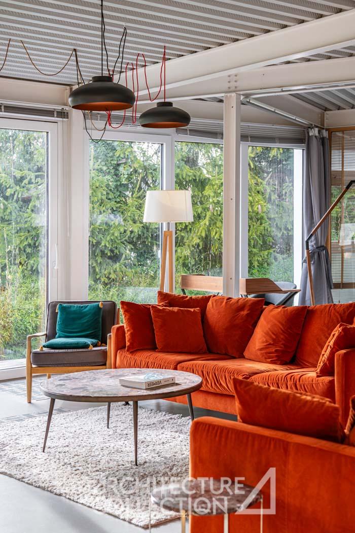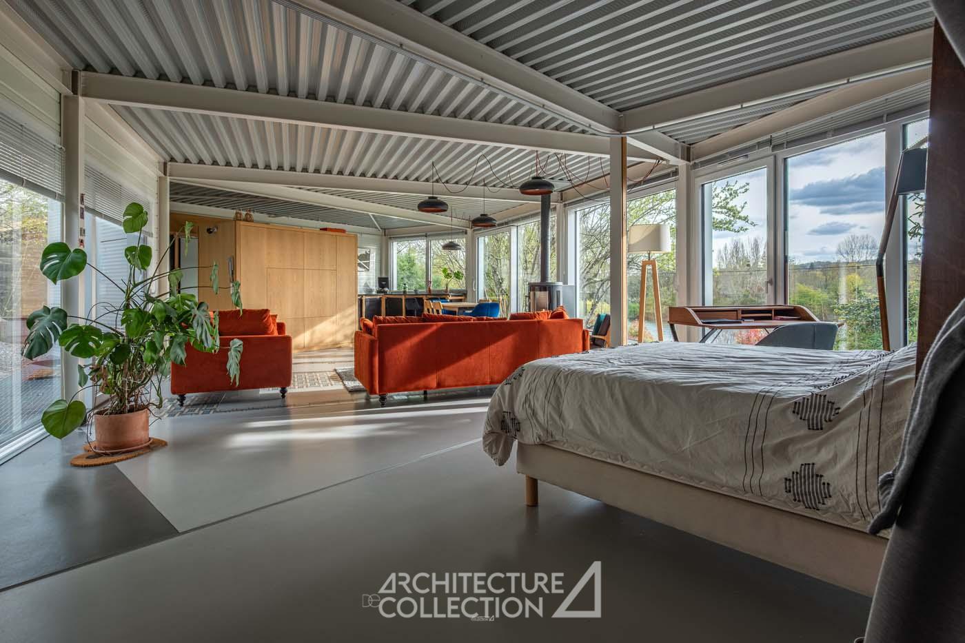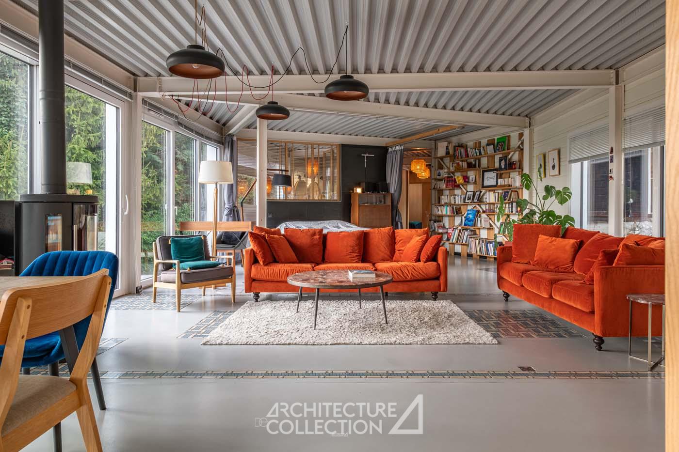 This circulation, of people and light, is facilitated by the many openings and the choice of an open floor plan that draws on loft characteristics. Industrial materials (polished concrete, metal beams, corrugated steel sheets) serve the space, allowing for extensive open-plan living and numerous openings. Moreover, the undulations of the roof sheets create a graphic effect that adds depth and space to the house.