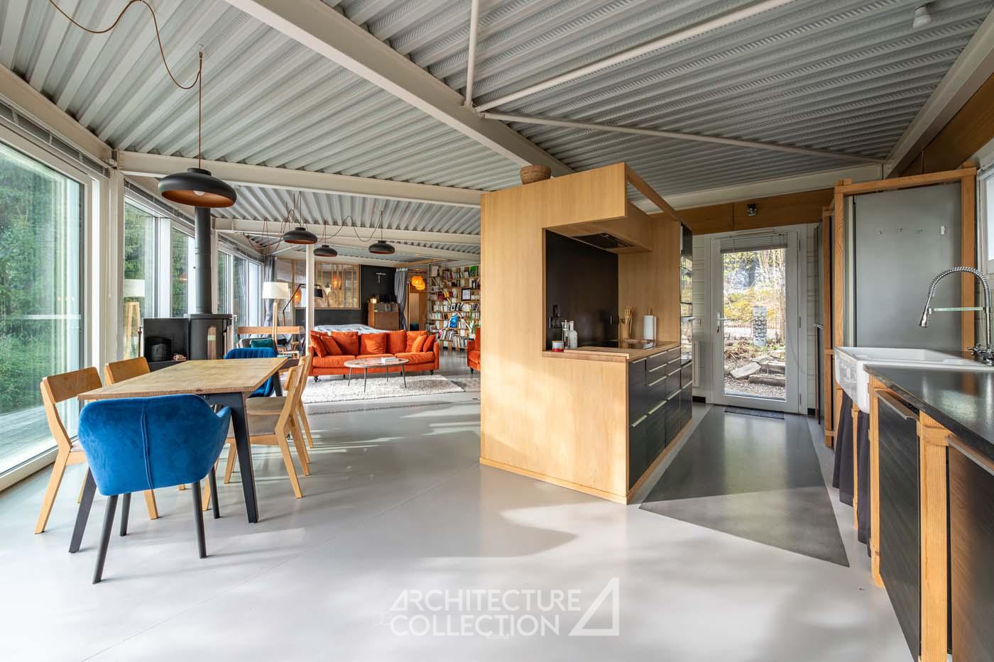 On a single level, the house first unfolds a large open-plan space featuring a living room with an electronic wood stove, a dining area, a fully equipped open kitchen, and a modular corner separated by a curtain rail that can serve as a bedroom. This 80 m² through-space is bathed in natural light thanks to numerous floor-to-ceiling windows.