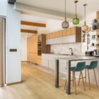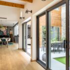 The ground floor opens onto an entrance leading to a spacious living area with an open-plan kitchen, living room, and dining room. This L-shaped space naturally extends to the patio.