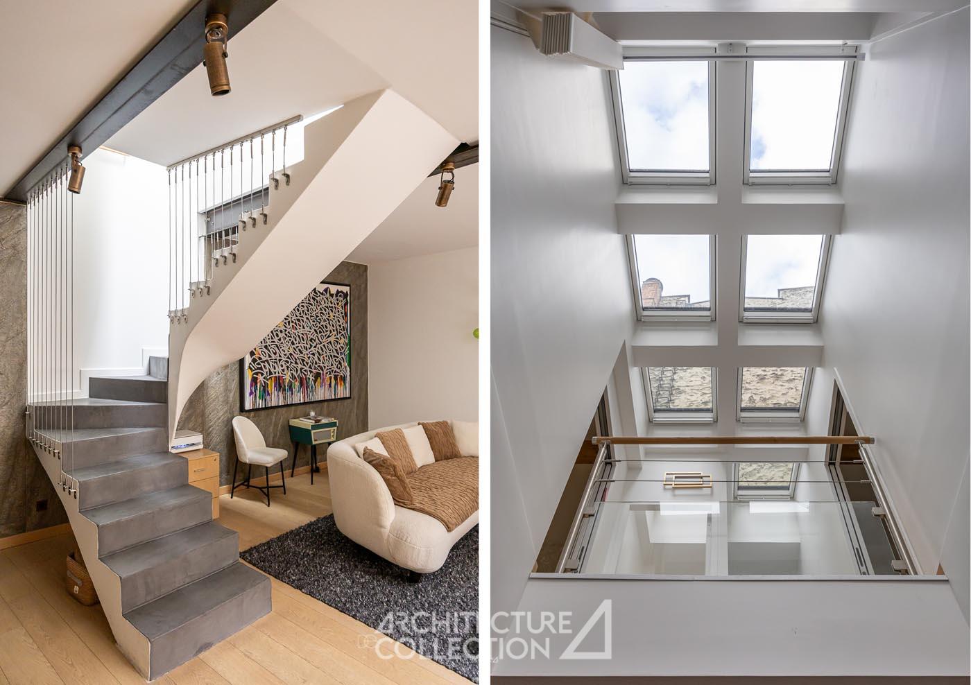 Focused on light and perspectives, the architecture establishes a relationship with space both horizontally, through the patio, and vertically, via the void created on the ground floor, topped with a Velux skylight. These two elements, central to the project, articulate the various spaces of the house. They are also essential for the circulation and diffusion of air and light.