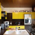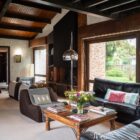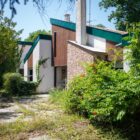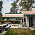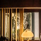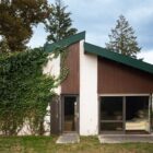The architectural identity of the site is defined by its asymmetrical roofs with inverted slopes, which animate the façade and sculpt unique interior volumes and shadow play. The exterior, simple and harmonious, combines light render, vertical wood cladding, brick walls, and forest-green joinery, creating a subtle palette perfectly in tune with its surroundings.