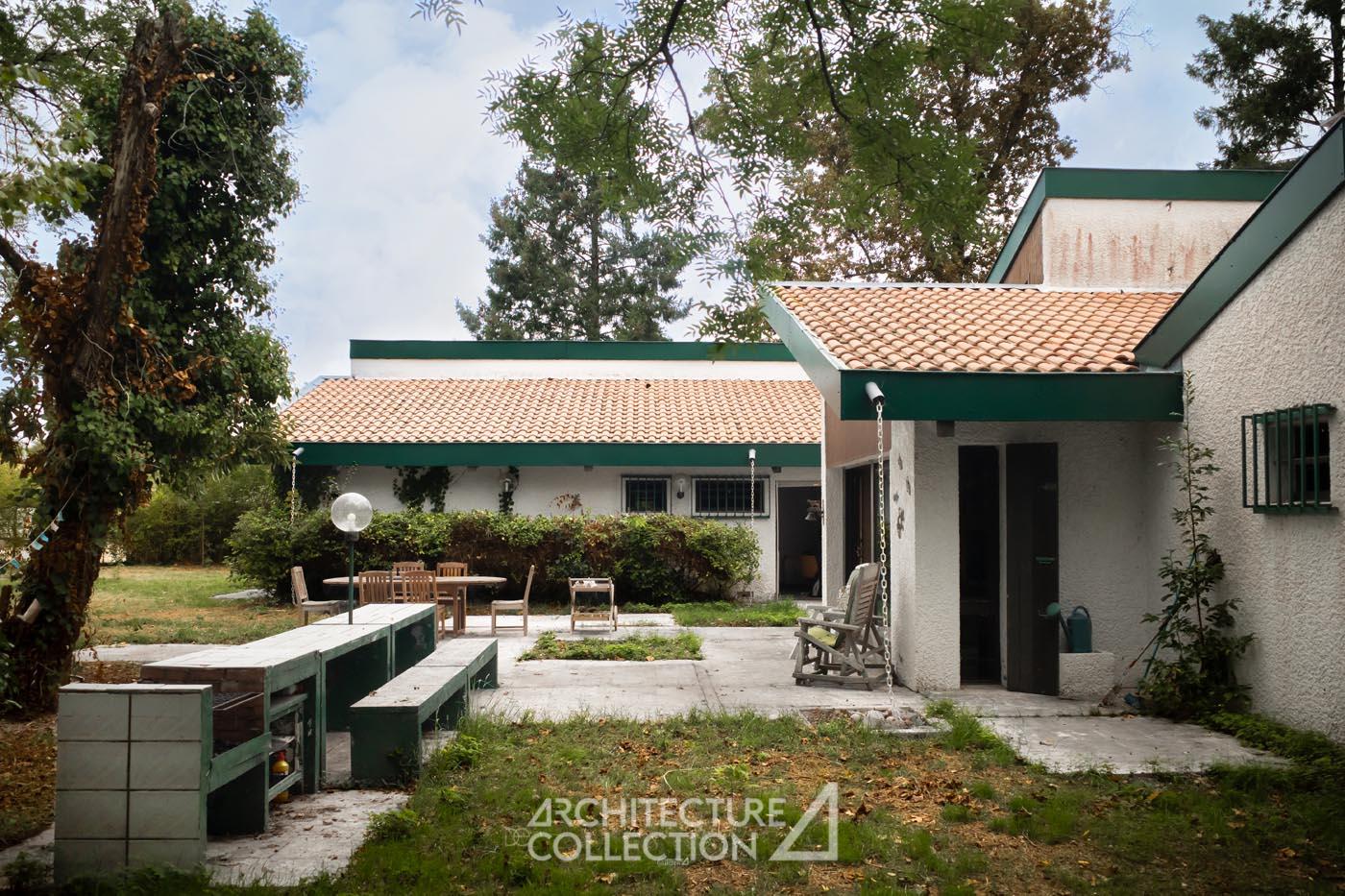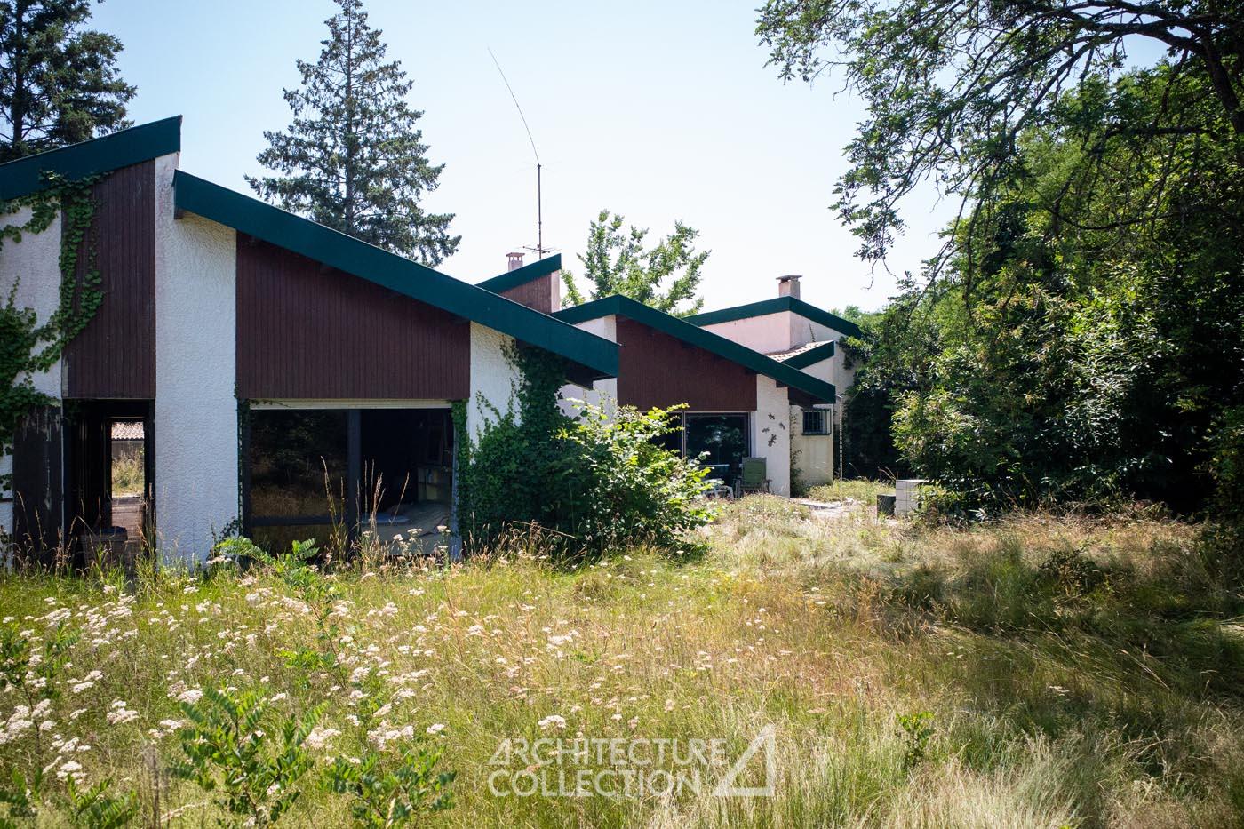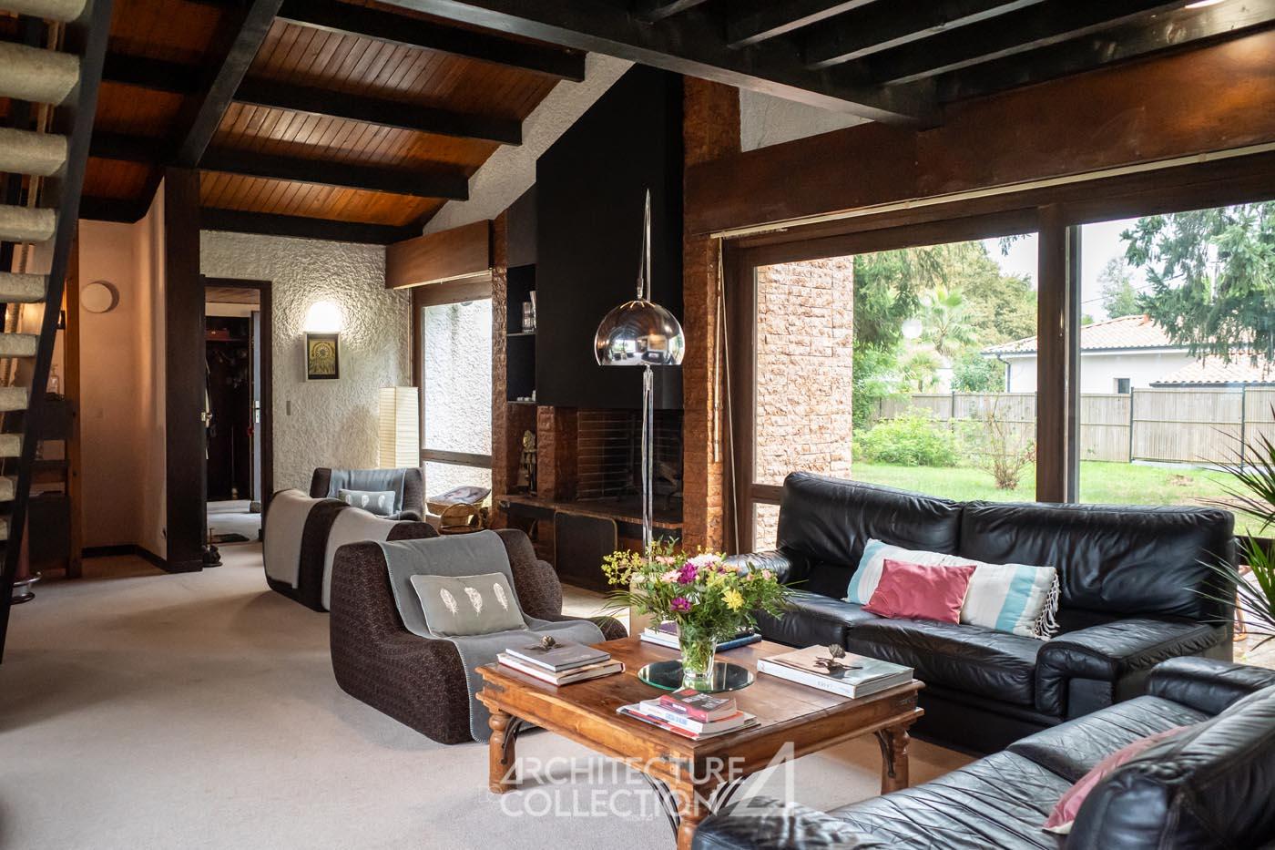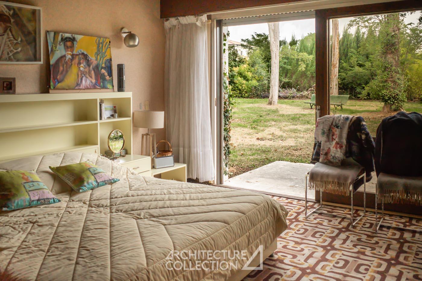 Located 25 minutes south of Bordeaux, at the heart of a wooded park of nearly 3,000 m², this residence designed by Jean-Jacques Boyer in 1971 perfectly embodies the spirit of the California Case Study Houses, reimagined here with a vernacular grammar of the Southwest.