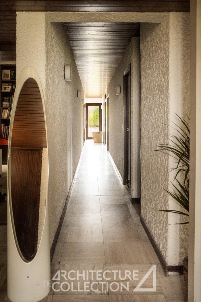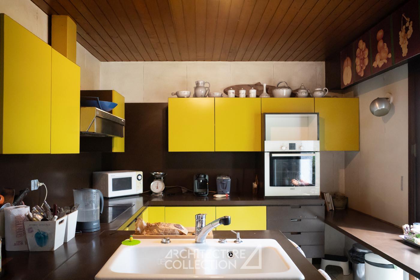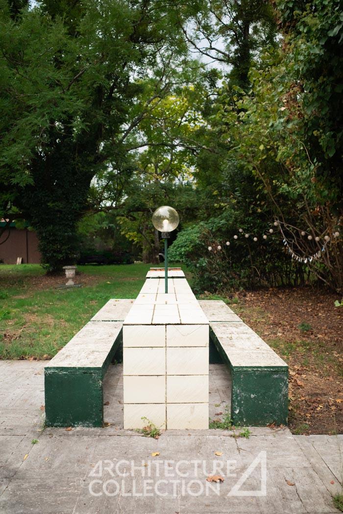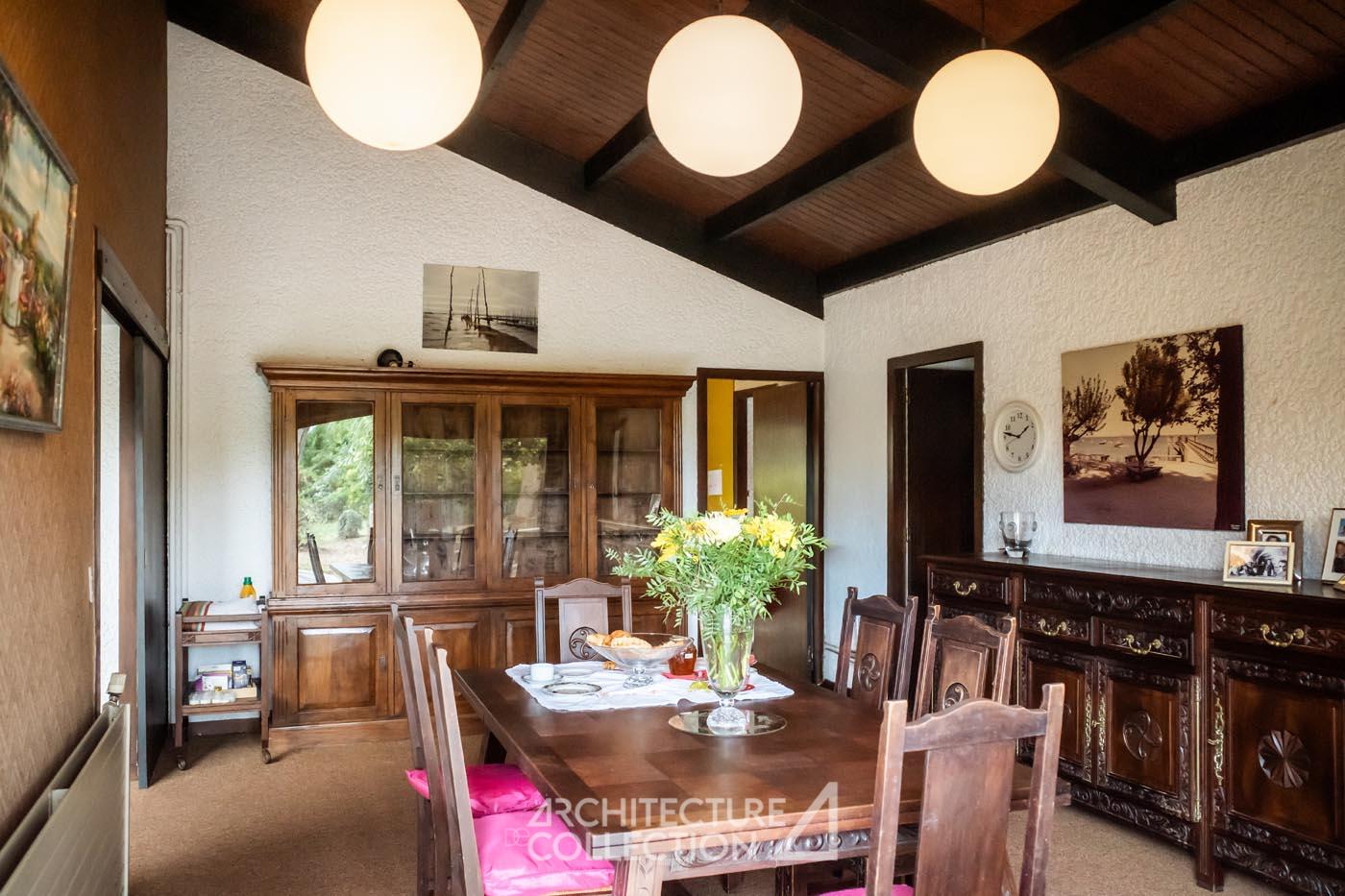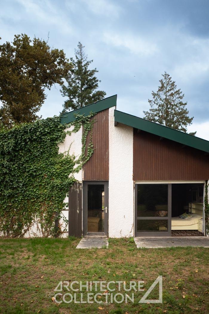 Located 25 minutes south of Bordeaux, at the heart of a wooded park of nearly 3,000 m², this residence designed by Jean-Jacques Boyer in 1971 perfectly embodies the spirit of the California Case Study Houses, reimagined here with a vernacular grammar of the Southwest.