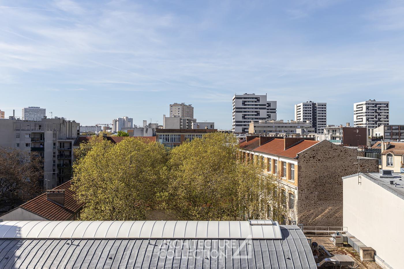 Located on a high floor, this balcony apartment is situated in the Flandre district of Paris. Completely renovated by the architects of ALORS Studio, it offers open and bright spaces.