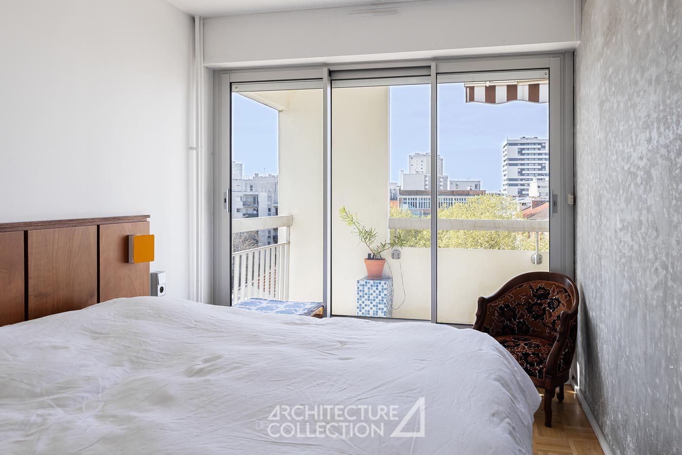 Every detail was designed to combine functionality and aesthetics: a discreet alcove in the entrance, ceramic cabinet handles designed by the architects, a large wooden door in the kitchen, and a custom headboard. The abundant natural light enhances these volumes, where contemporary minimalism meets characterful materials, such as raw concrete walls and oak parquet flooring.