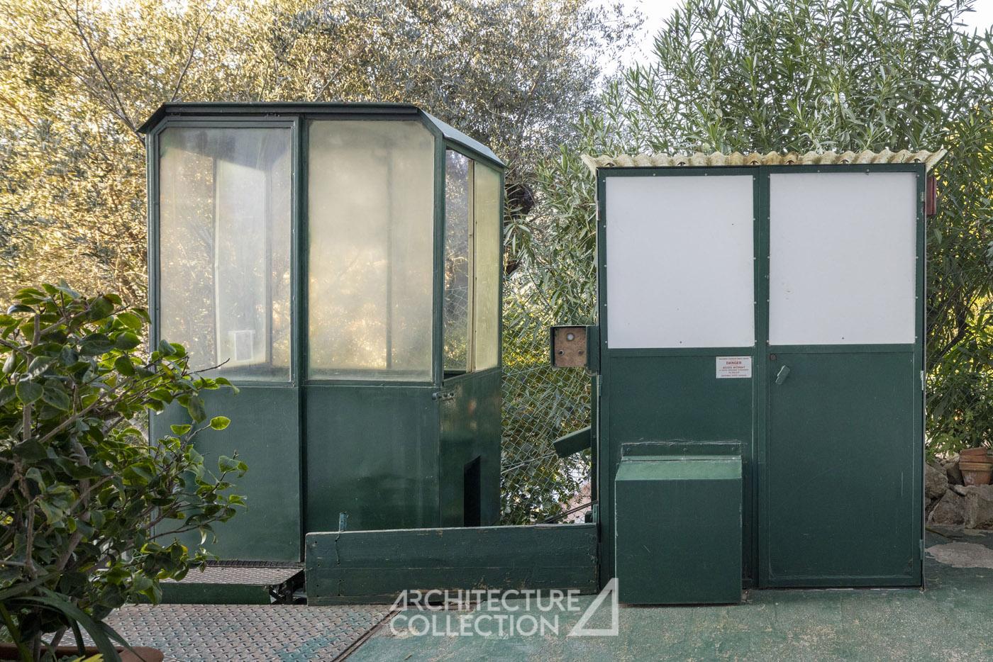The different levels are served on the north side by a system of stairs running along the façade, as well as by a funicular and a service staircase. The property includes a car shelter and several parking spaces. It has two entrances, one motorized from the street below and one pedestrian entrance at the top of the property.