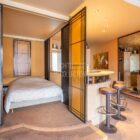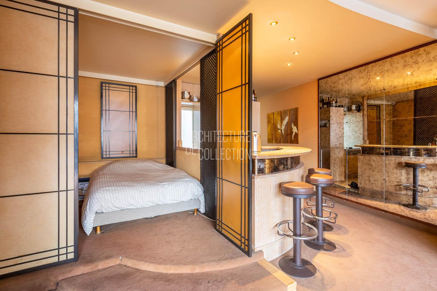 L’espace nuit est desservi par deux marches en arc de cercle, qui reprennent le dessin du bar de la cuisine. Des cloisons japonaises en bois permettent d’isoler la chambre de l’espace de vie.