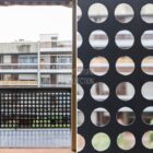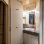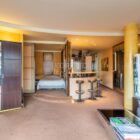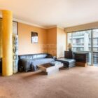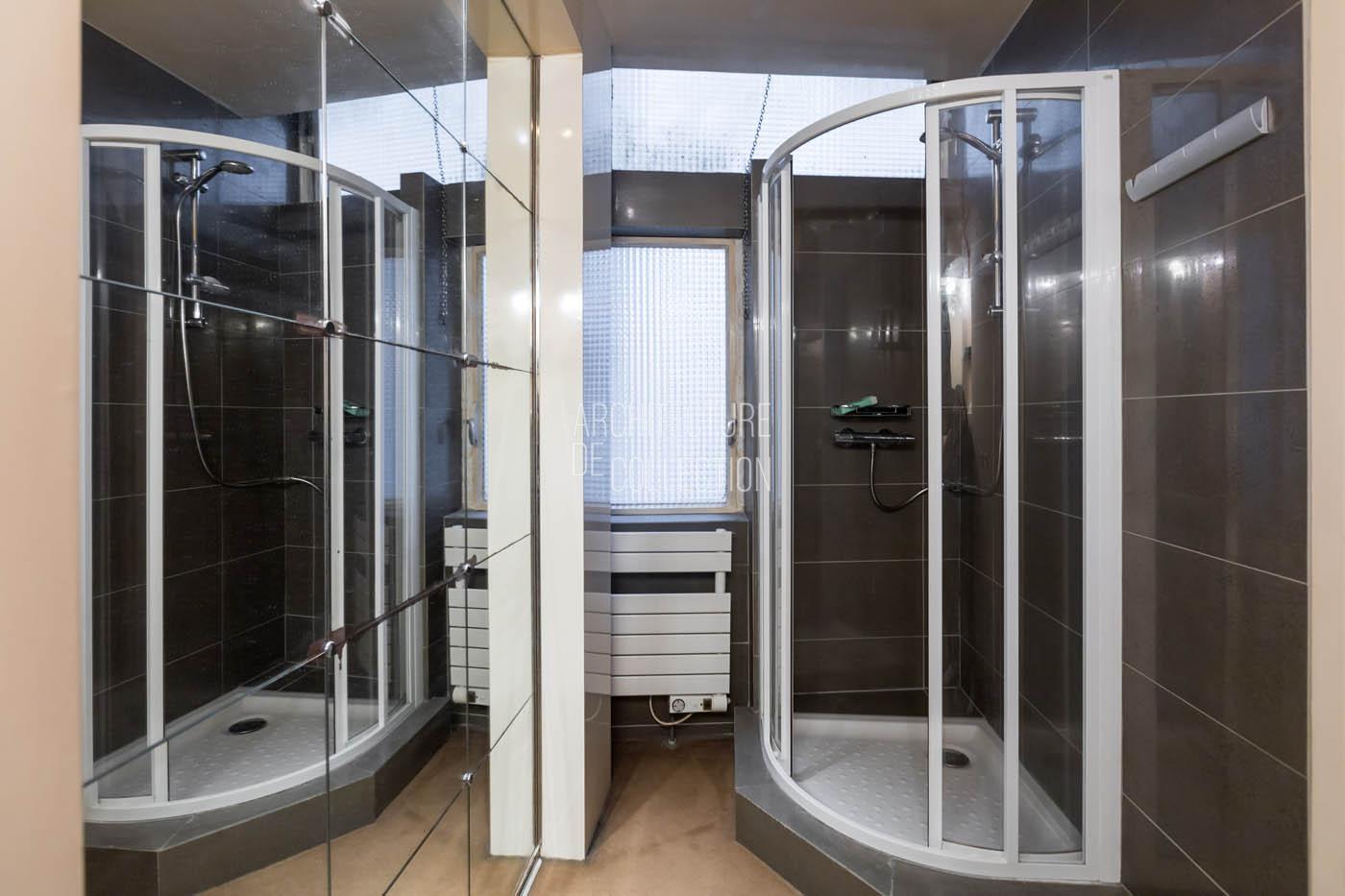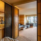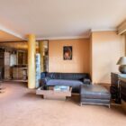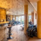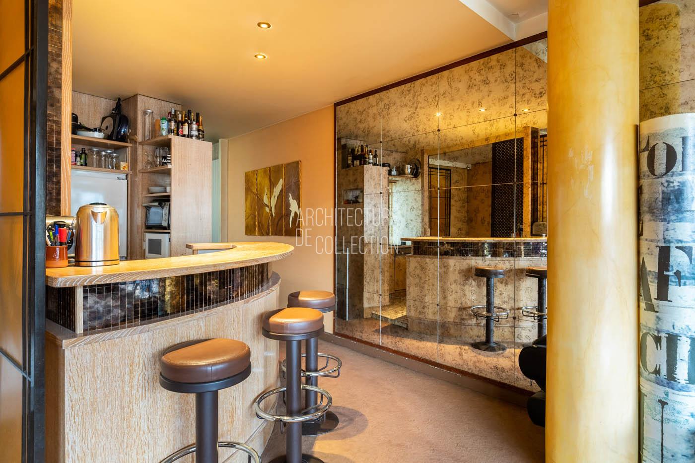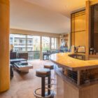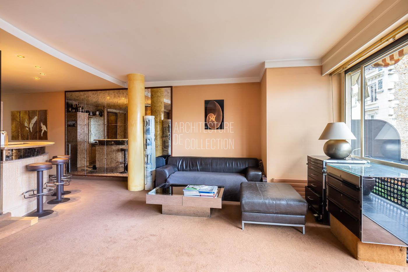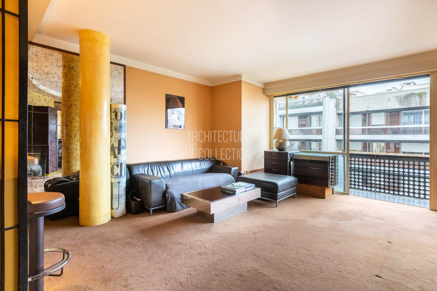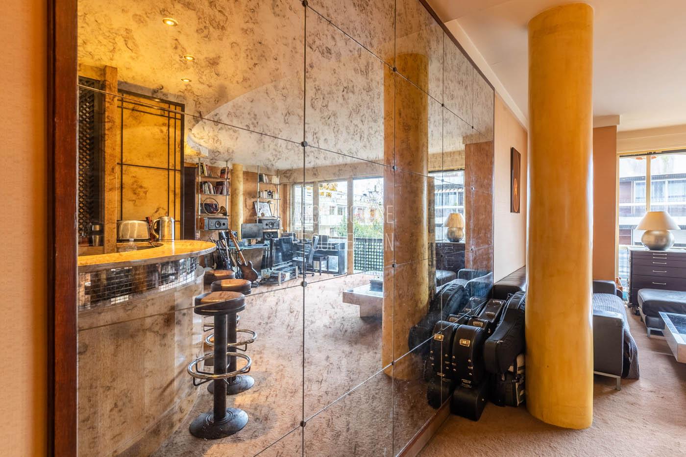 Le salon, agrandi visuellement par un mur de miroirs et animé par les poteaux structurels de l’immeuble, est délimité par une légère variation de hauteur de plafond qui dessine une grande courbe. Il est inondé de lumière naturelle grâce à ses grandes baies vitrées. Le balcon est bordé par un garde-corps en métal perforé peint en noir, au graphisme caractéristique de l’immeuble.