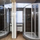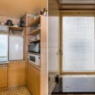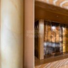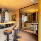 Une fenêtre en verre dépoli permet à la lumière naturelle d’éclairer la cuisine tout en préservant l’intimité du lieu. La cuisine présente des aménagements en bois réalisés sur mesure et se termine par un bar convivial en arc de cercle.