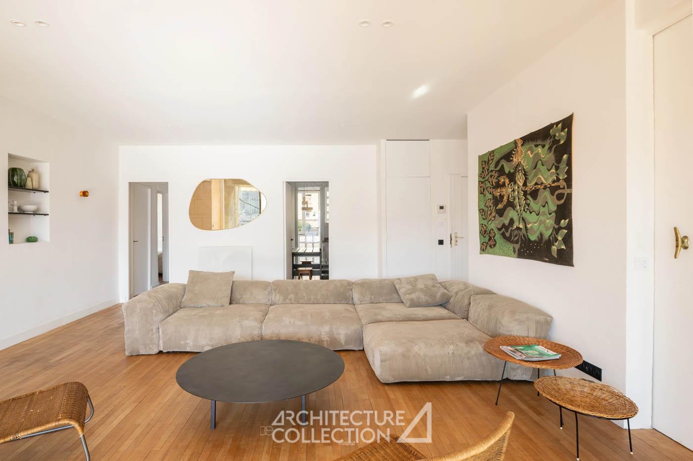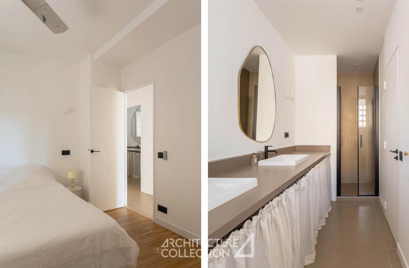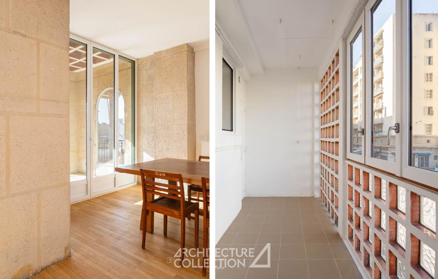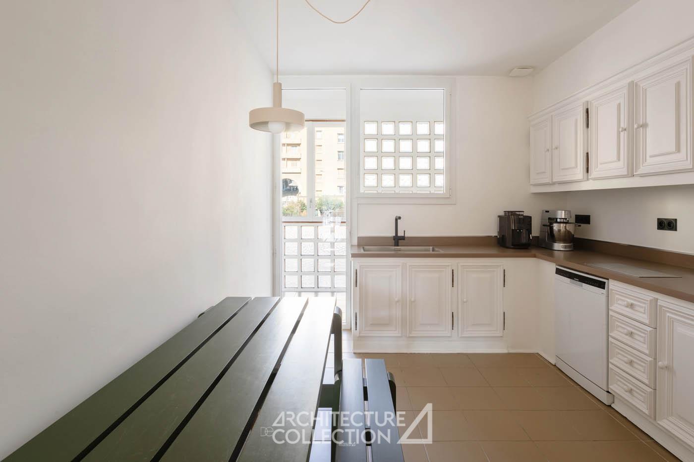 Il a fait l’objet d’une rénovation complète par les architectes d’intérieur Claudia-Liza Richerd Duloisy et Paul Moreau (Studio & Studio). Ils adoptent une approche minimaliste et sobre, qui sublime l’architecture d’origine. Le volume intérieur est scandé par les piliers porteurs en pierre massive du Gard laissé apparente, qui guide l’aménagement des espaces et apporte une atmosphère douce et chaleureuse. Les ouvertures à linteau cintré et les plafonds en caissons de terre cuite donnent à l’appartement tout son cachet résolument méditerranéen. Le parquet d’origine a été conservé dans le salon.