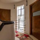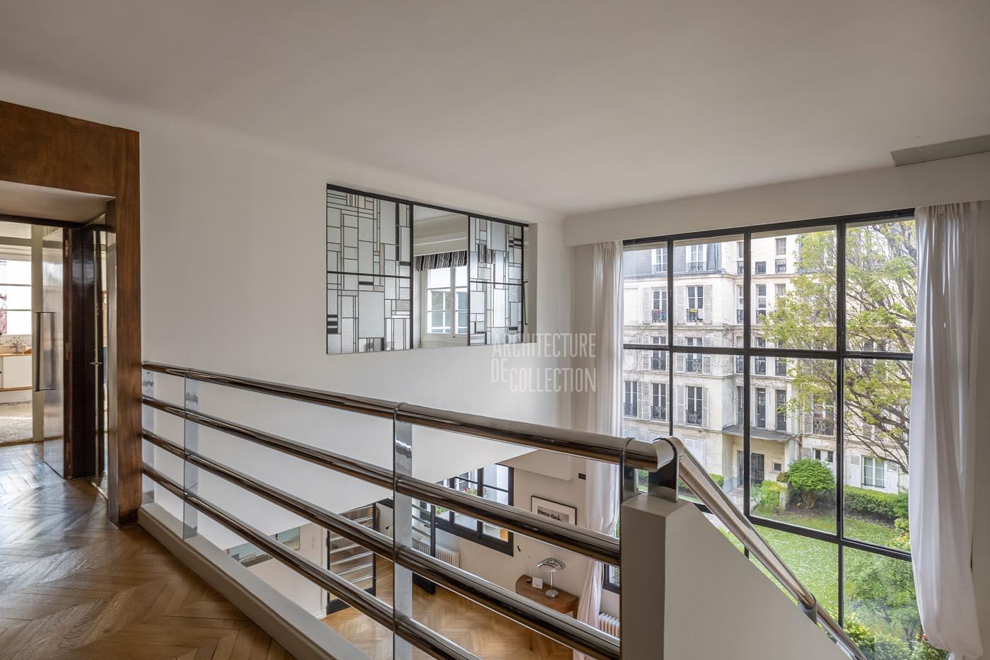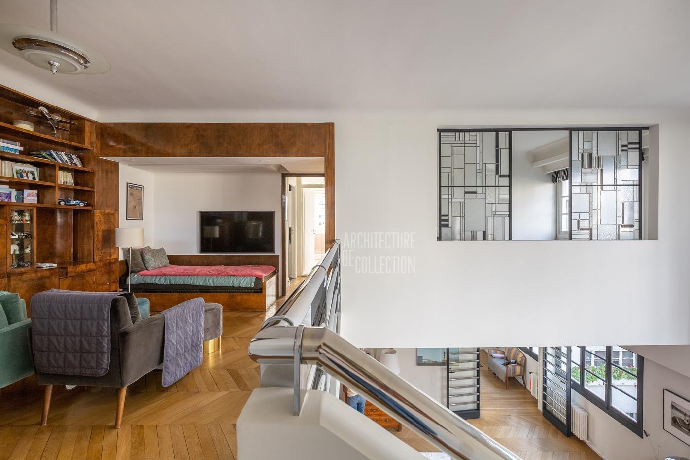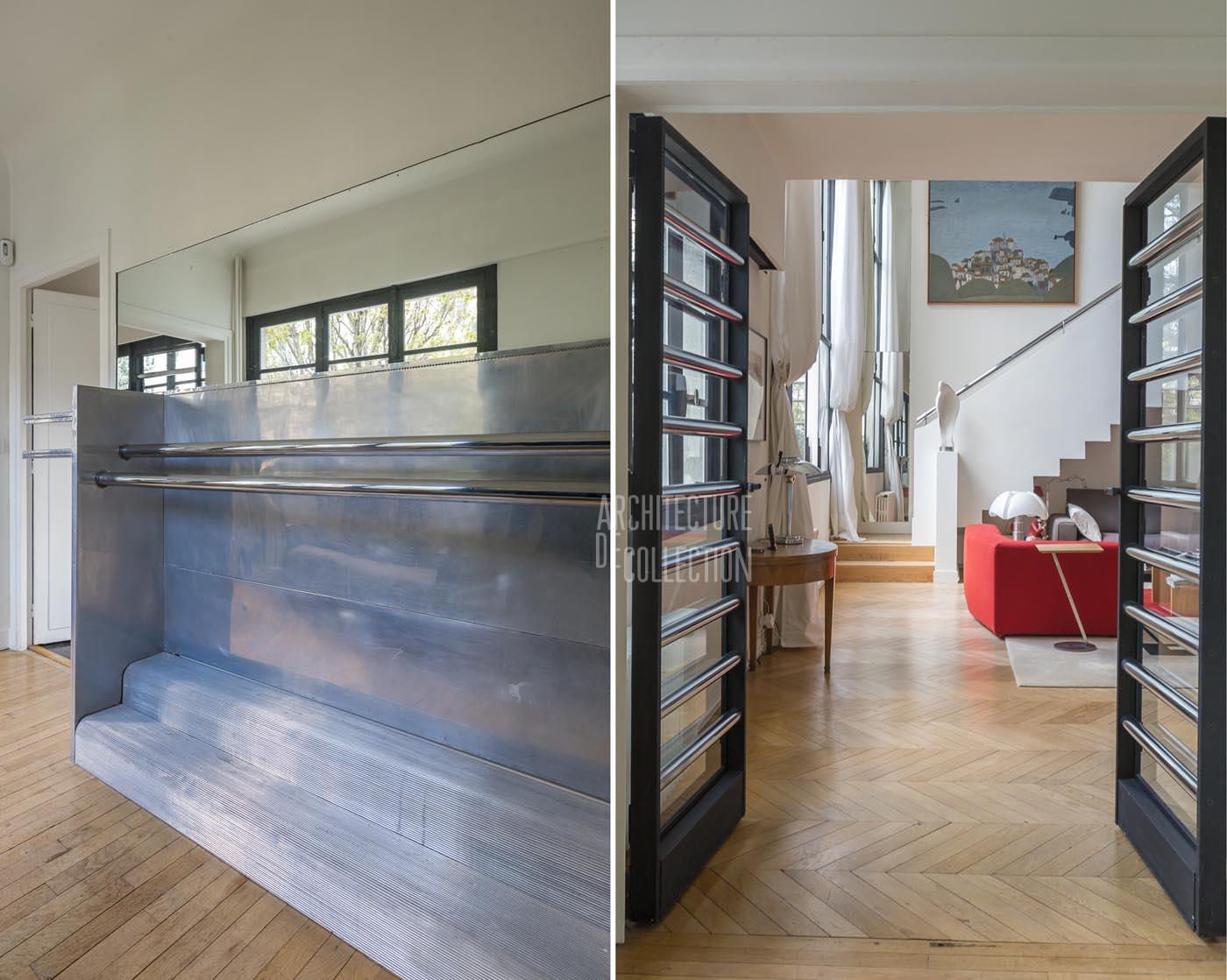 Dans l’entrée, le meuble de rangement, les appliques murales et le porte-chapeau plaqués de métal nickelés ainsi que la porte à double battant en métal patiné noir et tubes chromés menant à l’espace de réception ont été dessinés sur mesure par l’architecte Adrienne Gorska, sœur de Tamara de Lempicka. Elle réalise aussi sur la mezzanine un ensemble composé d’un bar arrondi et d’un fumoir avec boiseries en ronce de noyer, secrétaire intégré, une paire de fauteuils bas, une banquette et une table basse assortie, en collaboration avec Robert Mallet-Stevens. L’architecte décorateur René Herbst et l’éclairagiste André Salomon signent un plafonnier sculptural dans le salon. Le maître verrier Louis Barillet compose un vitrail en verre imprimé, verre opale et miroir serti dans un cadre en fer patiné noir pour la seconde chambre (à l’origine utilisée comme bureau).