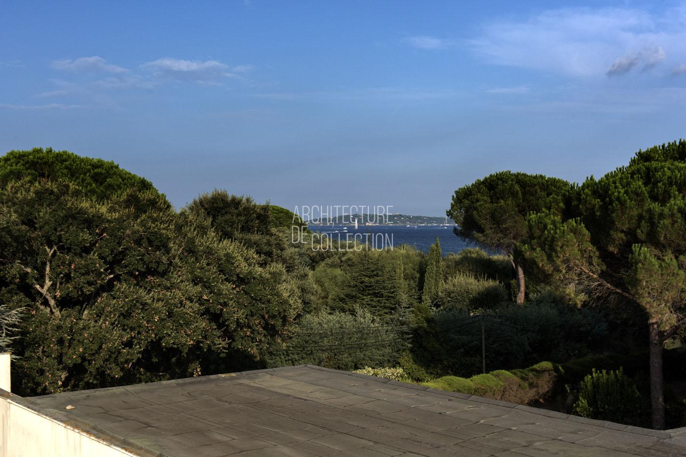 Conçue à l’image d’un paquebot, la maison rompt avec la distribution traditionnelle des espaces : la partie nuit occupe le rez-de-chaussée pour plus d’intimité, tandis que les espaces de vie, à l’étage, profitent d’une vue dégagée sur le Golfe de Saint Tropez. Remarquablement préservée, elle a conservé la majorité de ses aménagements d’origine.