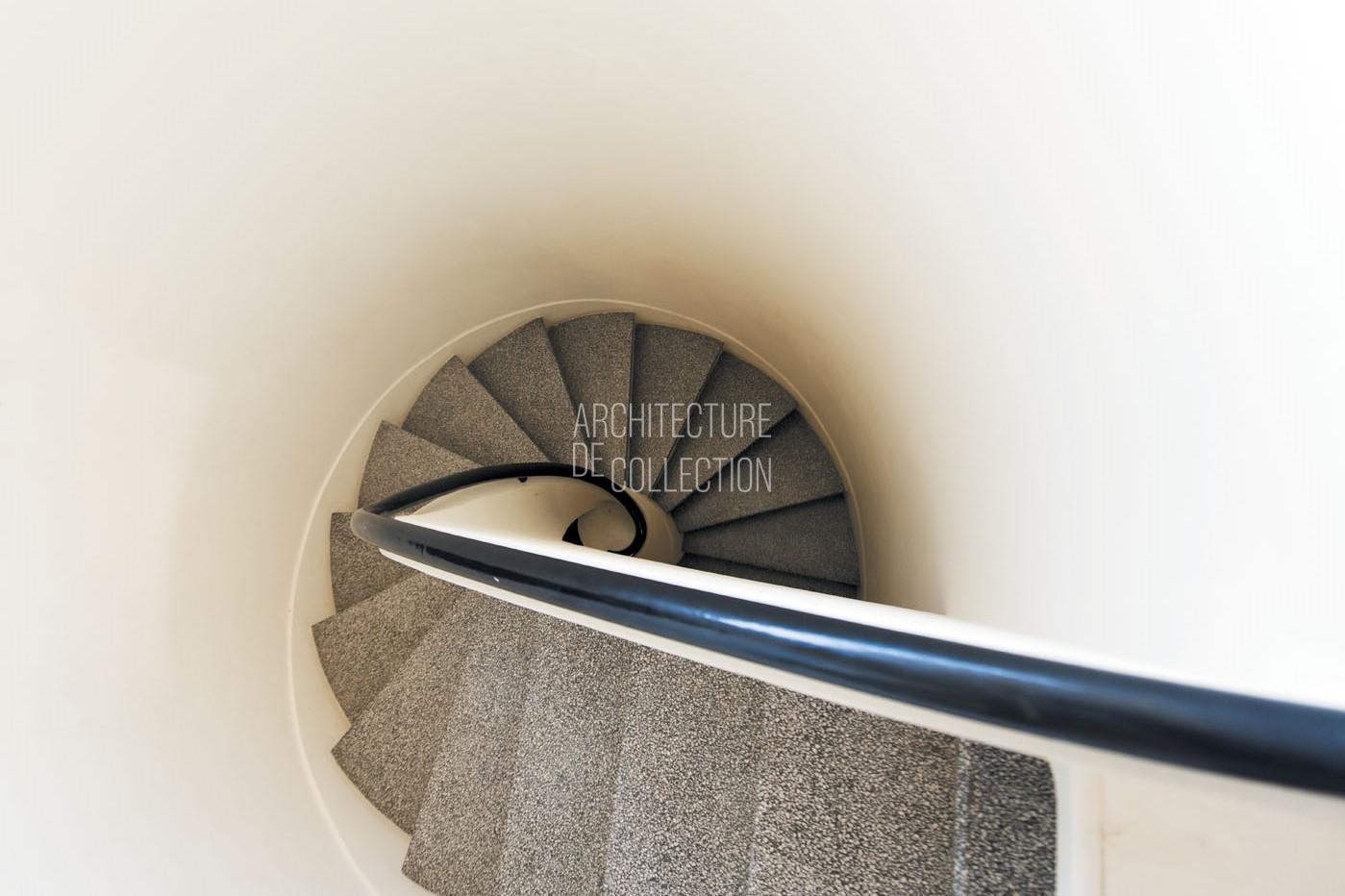 La façade de la maison s’inscrit dans le style « Paquebot », apanage du luxe dont raffole la clientèle fortunée des années 1920. L’esthétique transatlantique captive par ses bastingages, ses vastes baies vitrées panoramiques et ses matériaux rappelant l’univers nautique. Ici, les lignes horizontales du bâti, les fins garde-corps métalliques, les jeux de terrasses rappelant les coursives des ponts et passerelles d’un navire ainsi que le volume cylindrique évocateur de l’escalier, projettent les habitants dans l’imaginaire du voyage.