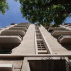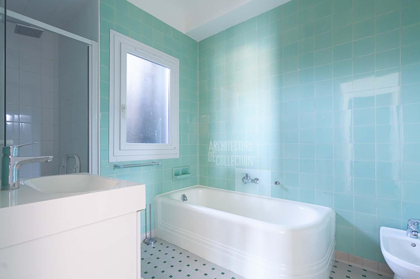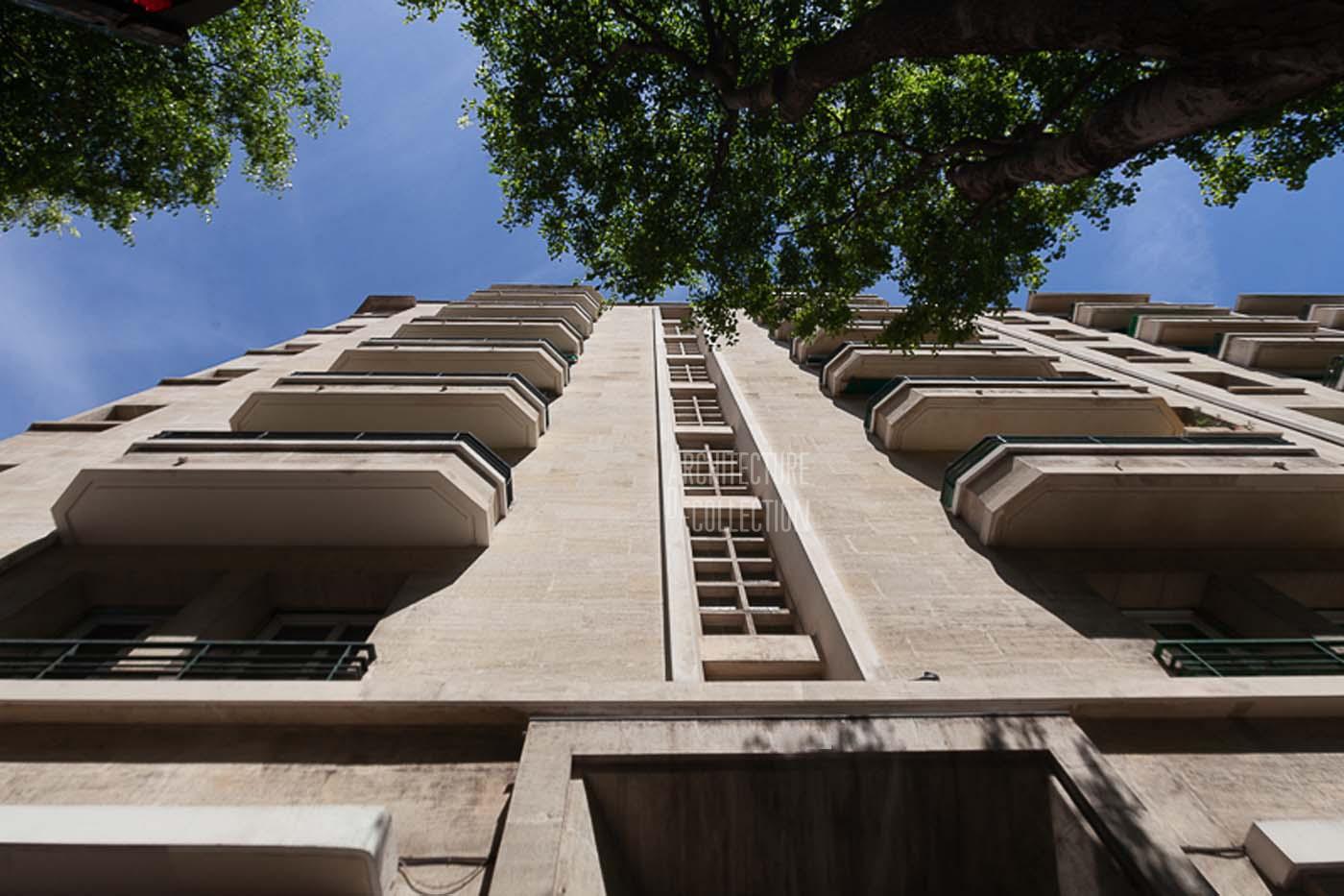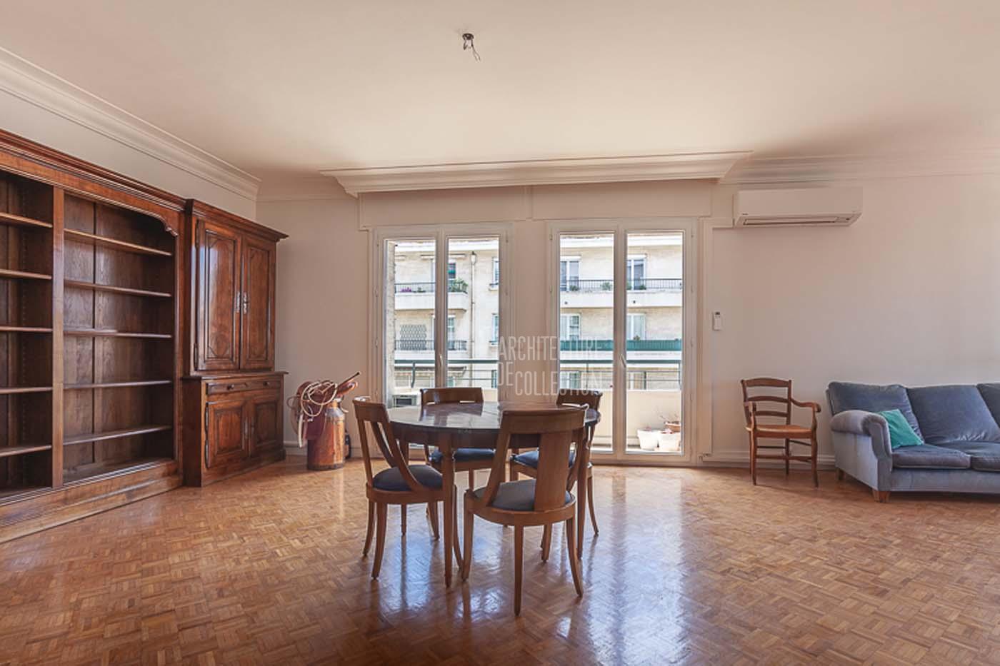 Cet appartement se situe en étage élevé au sein d’un bel immeuble en pierre de taille à l’esthétique moderniste, construit dans les années 1950.
