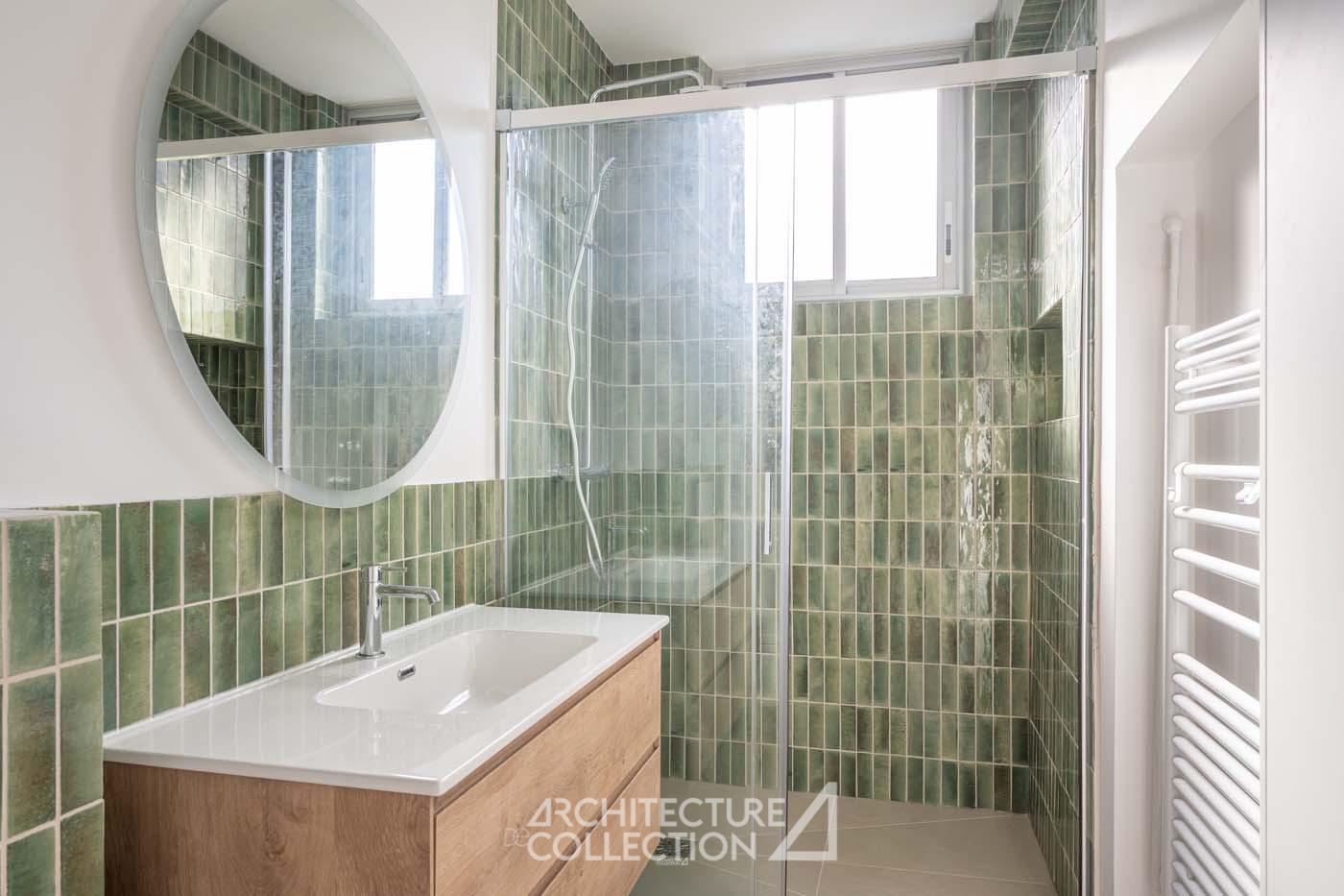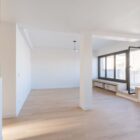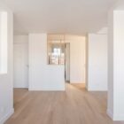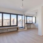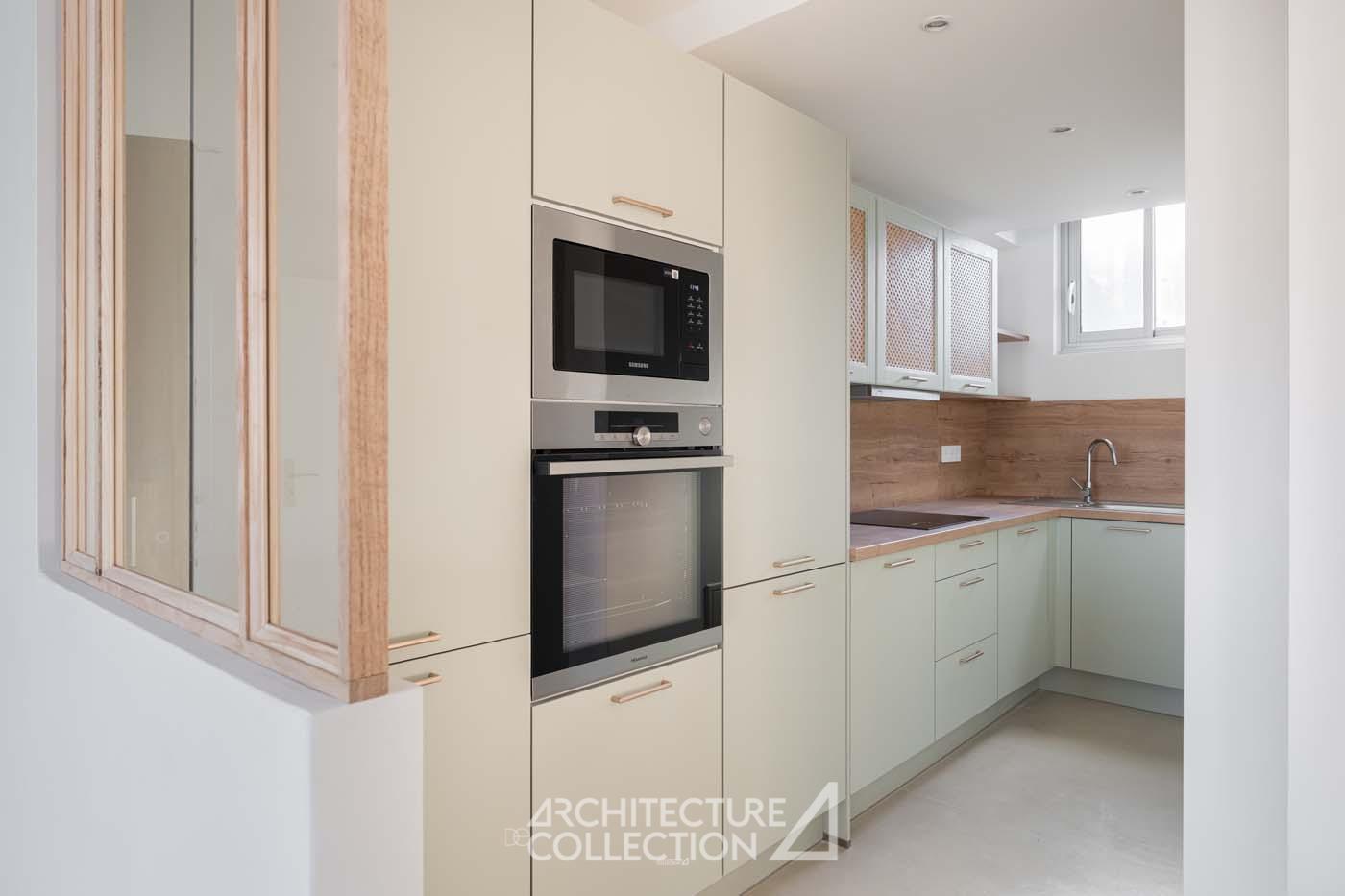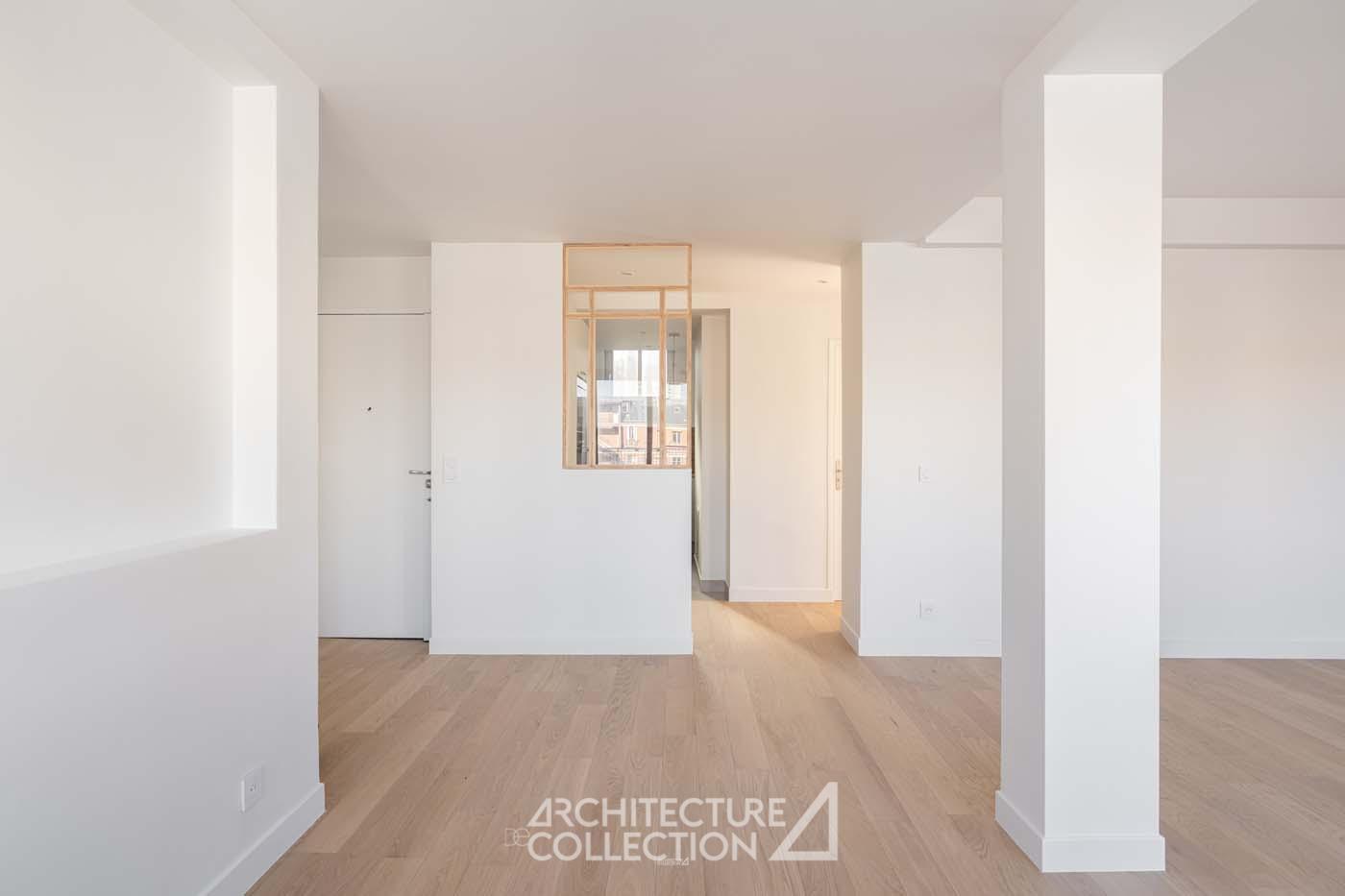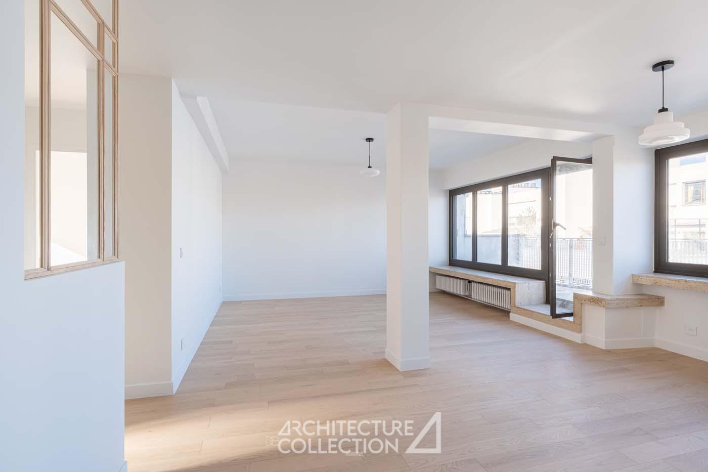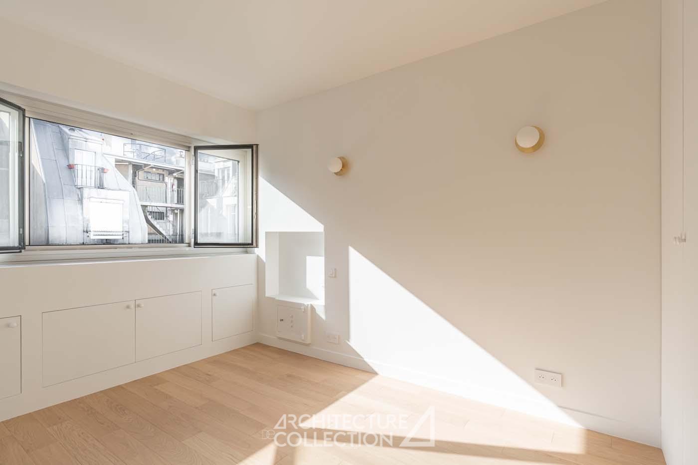L’esprit épuré et minimaliste de l’appartement permet une grande liberté d’aménagement. Certains éléments d’origine comme les tablettes en pierre, qui longent et habillent les baies du séjour et d’une des chambres ont été soigneusement conservés.