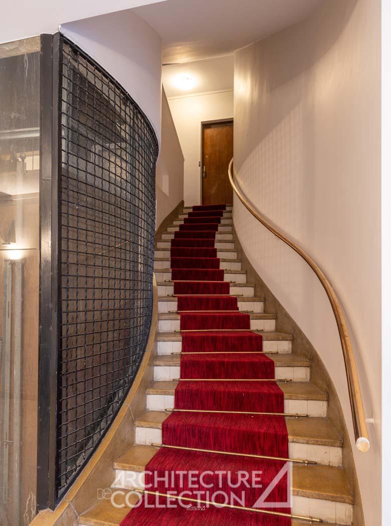 L’habituel angle en rotonde prend ici la forme d’un cylindre lisse, percé de verrières horizontales et surmonté d’une terrasse végétalisée. De part et d’autre de ce cylindre, les deux façades présentent une géométrie inversée. L’une, en haut de laquelle est situé ce bien, arbore une trame massive et pleine rythmée par des fenêtres en bandeau, caractéristique de la modernité. L’autre façade, aérienne, est largement évidée grâce aux balcons filants des appartements.