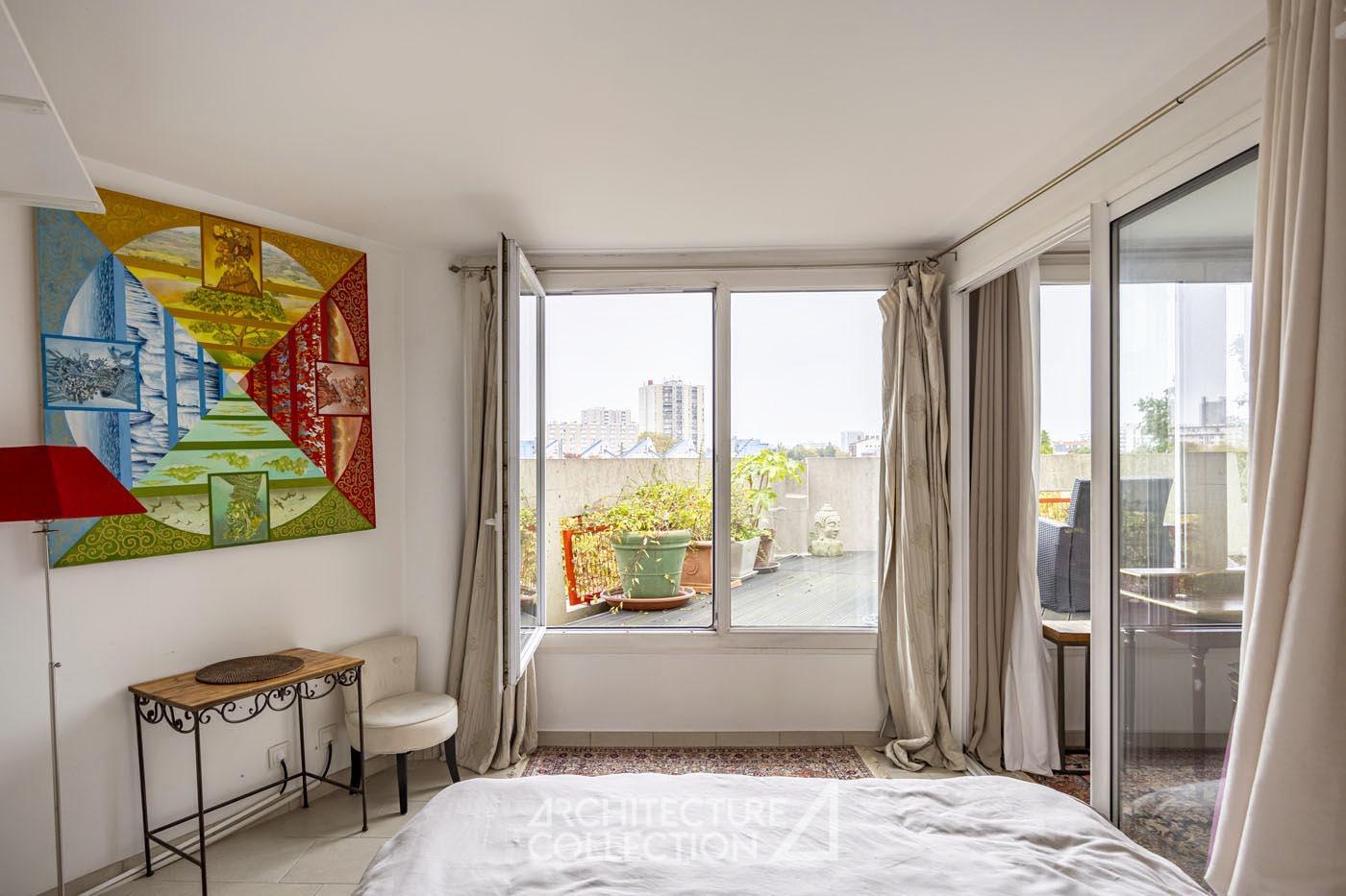 L’espace de vie est prolongé à l’Ouest par une terrasse de 20 m² qui offre une vue dégagée sur une skyline et à l’Est par une seconde terrasse de 10 m² au niveau de la cuisine.