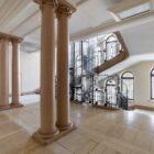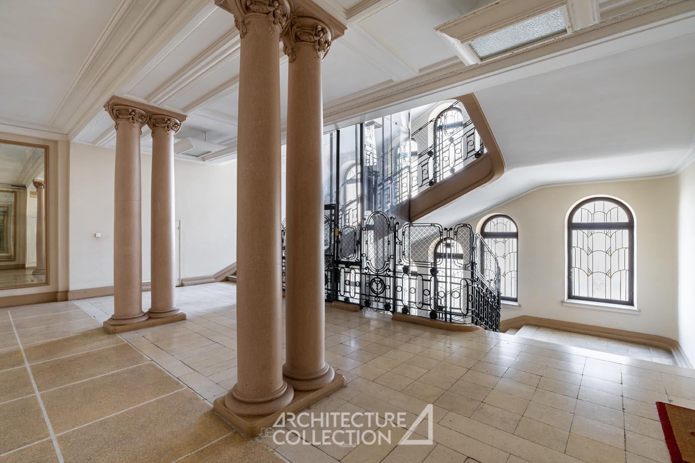 Les parties communes et l’ascenseur imposant, ainsi que des détails tels que le travail de menuiserie, les escaliers en pierre, les colonnes et les vitraux géométriques, rappellent son passé fastueux. Héritier des grands salons et galeries d’origine, l’immeuble conserve une structure généreuse, avec des couloirs larges et des halls majestueux.
