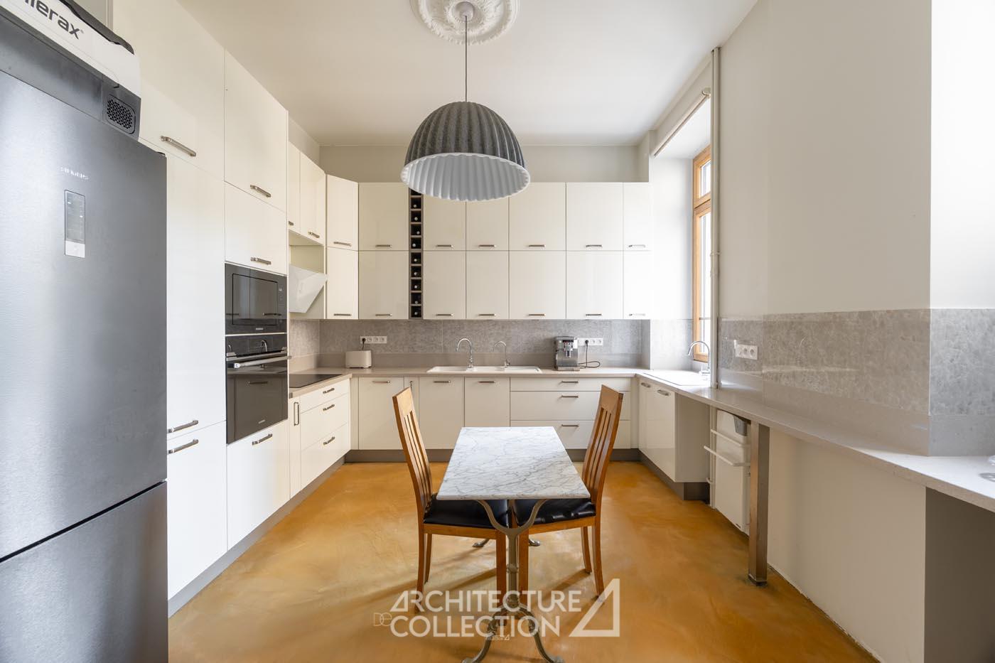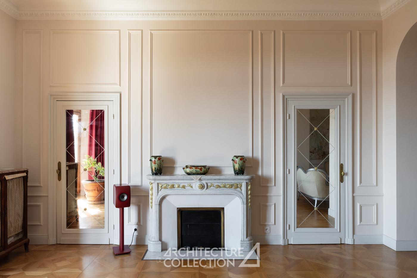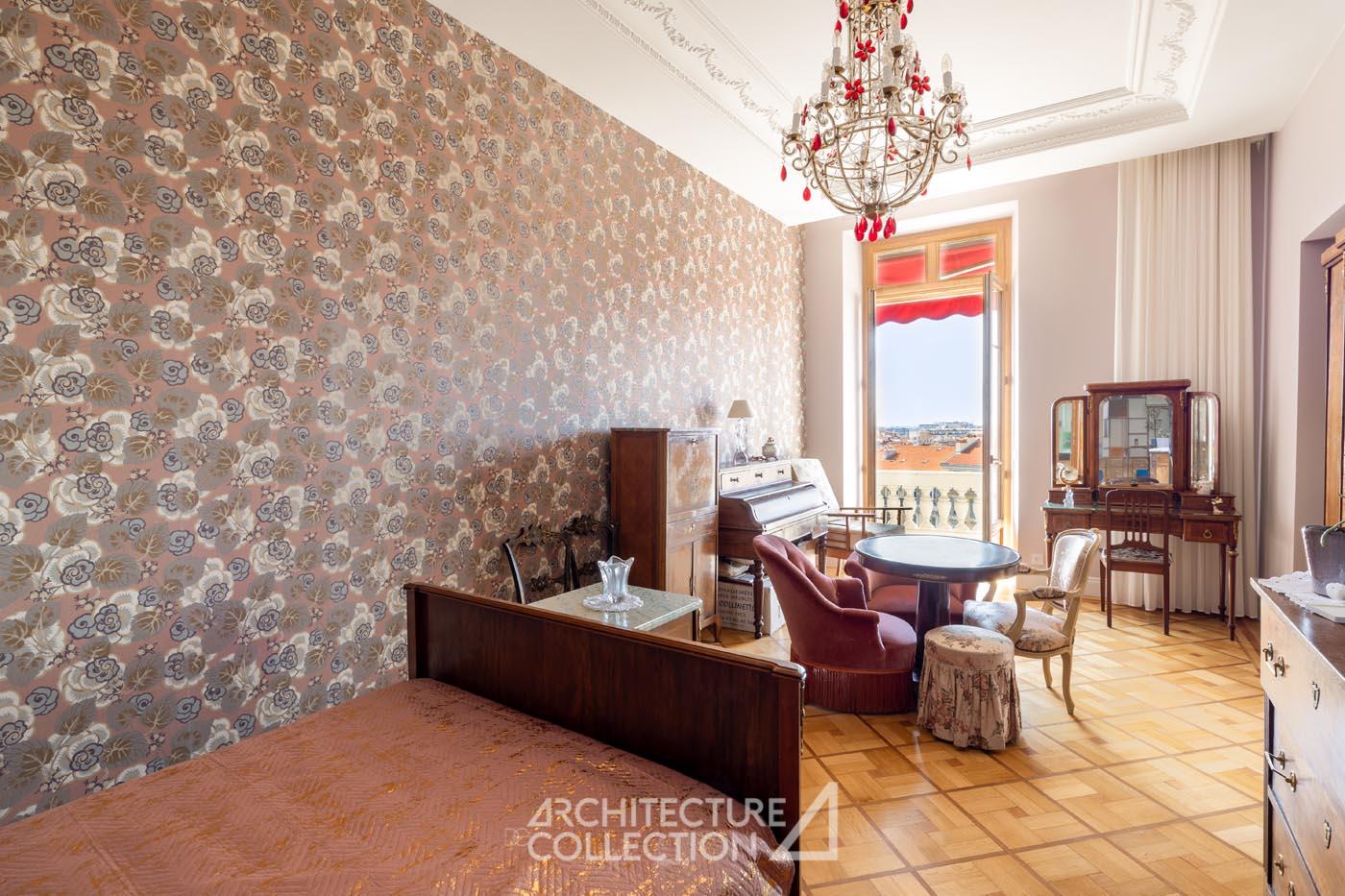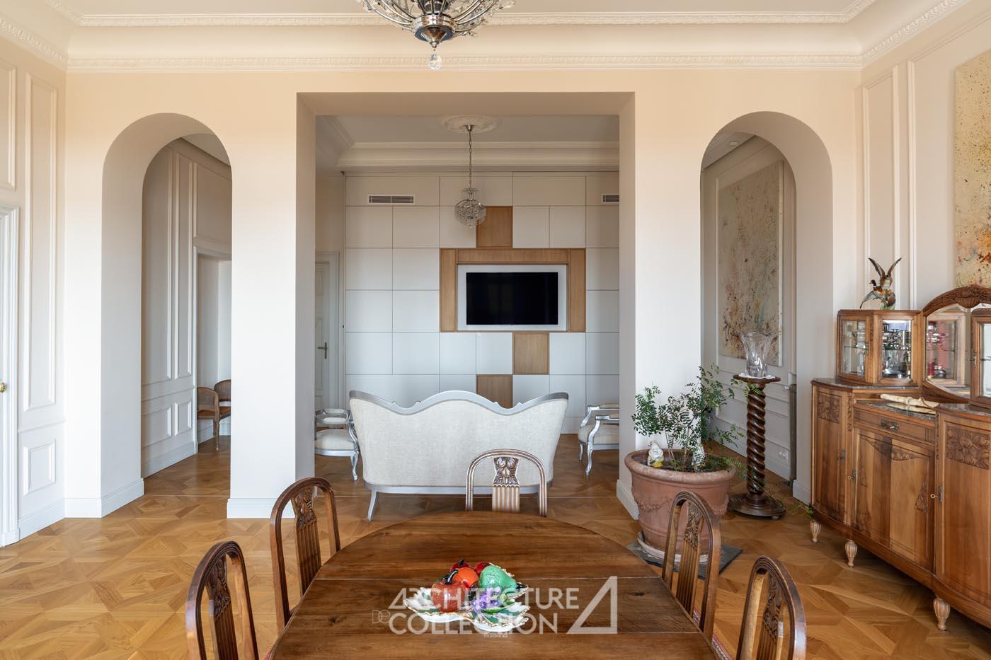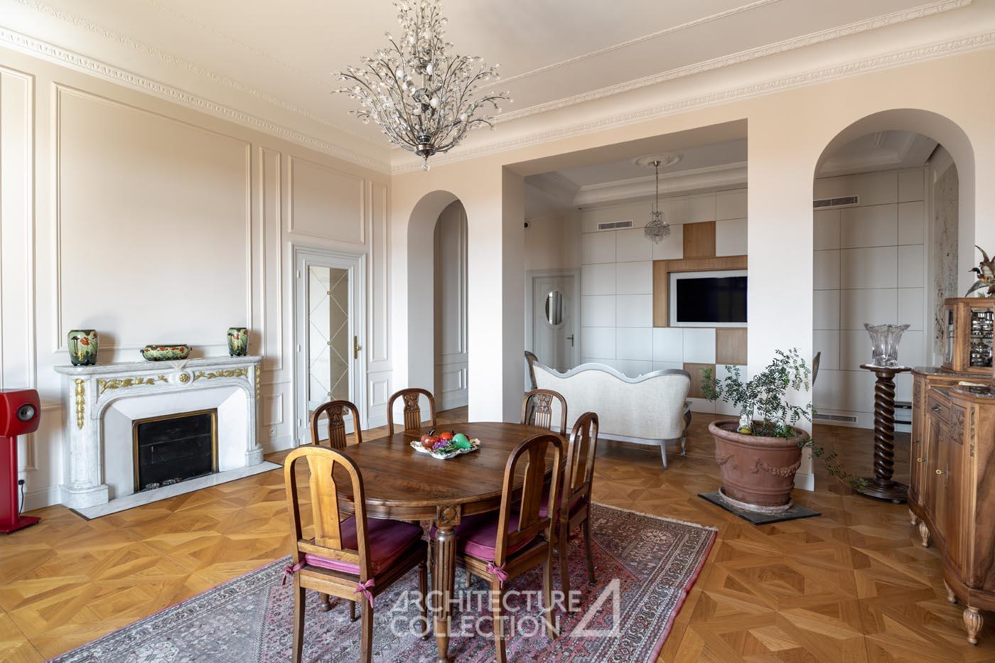 Les éléments d’origine tels que les arches, les moulures et les boiseries ont été conservés, sublimant le caractère bourgeois de cet appartement. Les grandes ouvertures, balcons, et bow-window inondent les espaces de lumière et sont animés par les vues sur le paysage ; tandis que la circulation traversante et la belle hauteur sous plafond garantit une ventilation naturelle.
