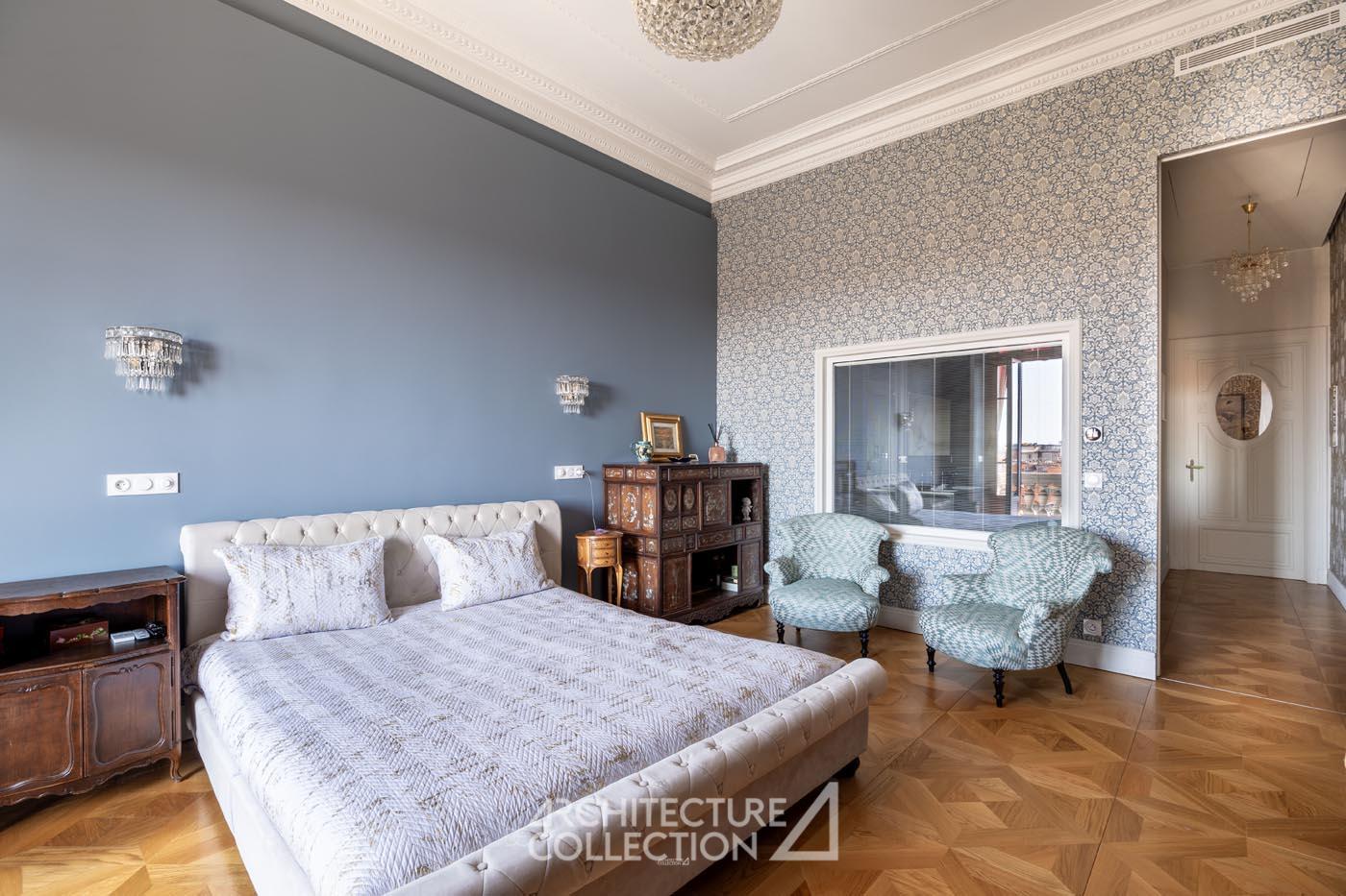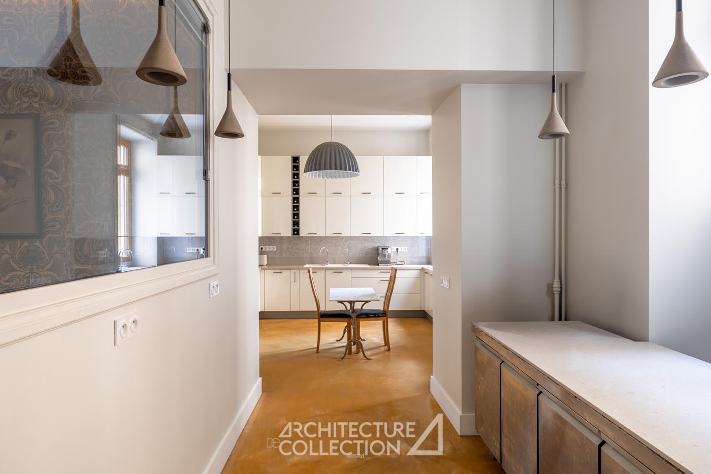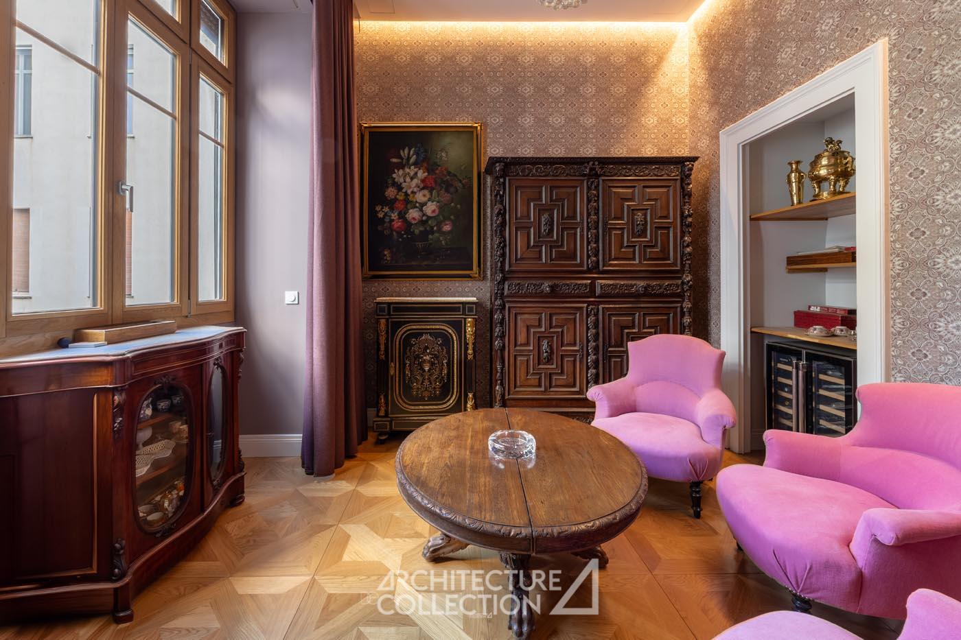 Le séjour, de 57 m², est composé d’un salon avec mobilier et éclairage sur mesure. Un espace salle à manger dotée d’un bow-window, prolonge cet espace de réception. Ces pièces de vie bénéficient d’une grande luminosité et d’une hauteur sous plafond de près de 3,70 m.