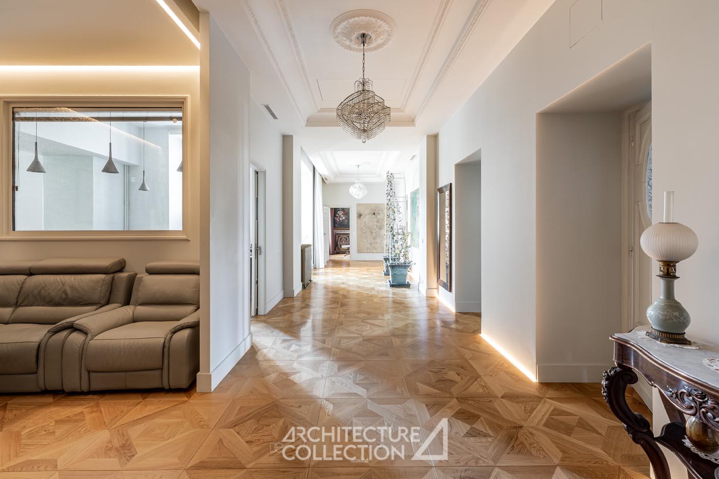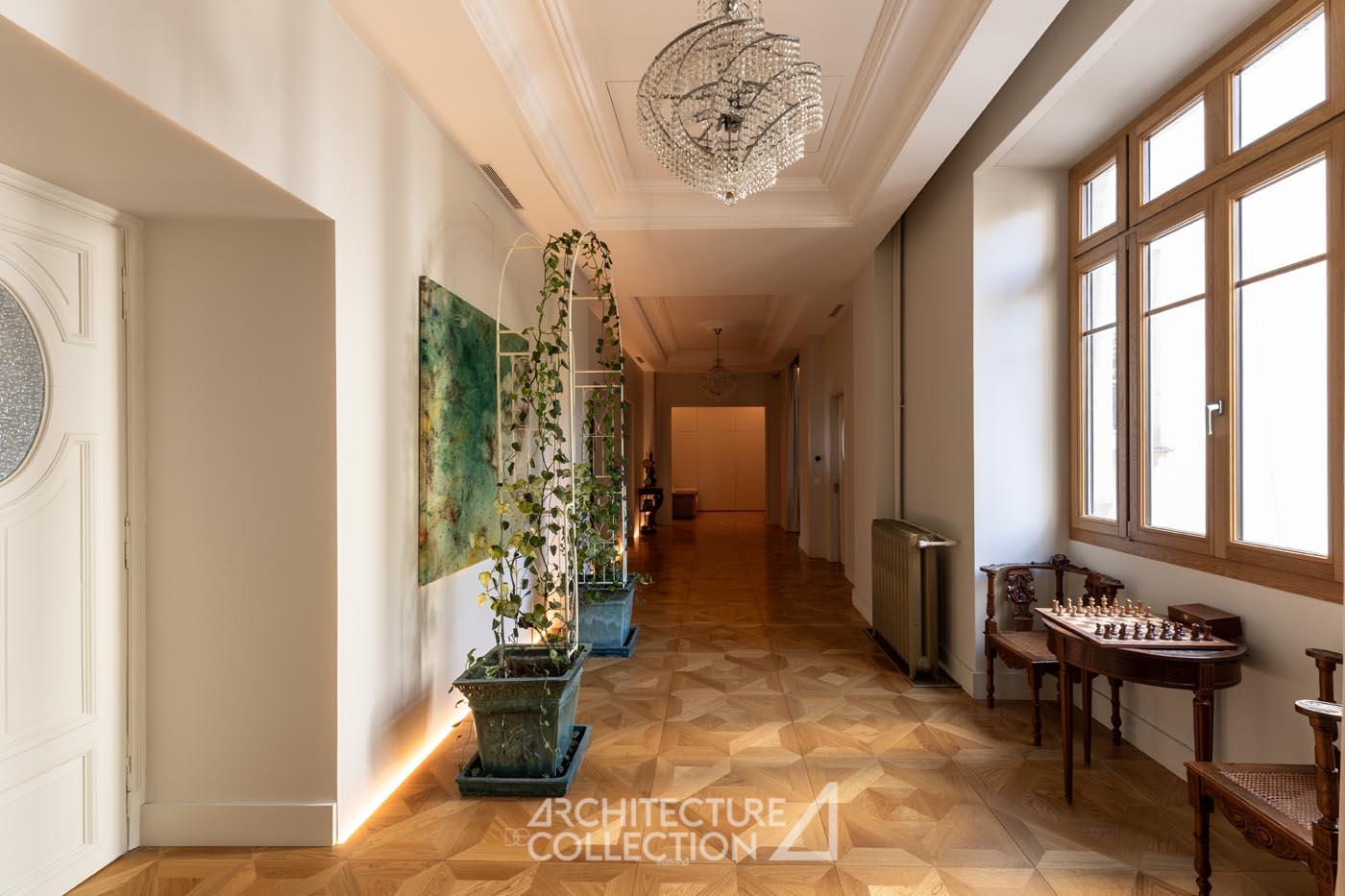 L’appartement s’articule autour d’une vaste galerie d’entrée de 46 m², depuis laquelle se distribuent l’ensemble des pièces.
