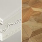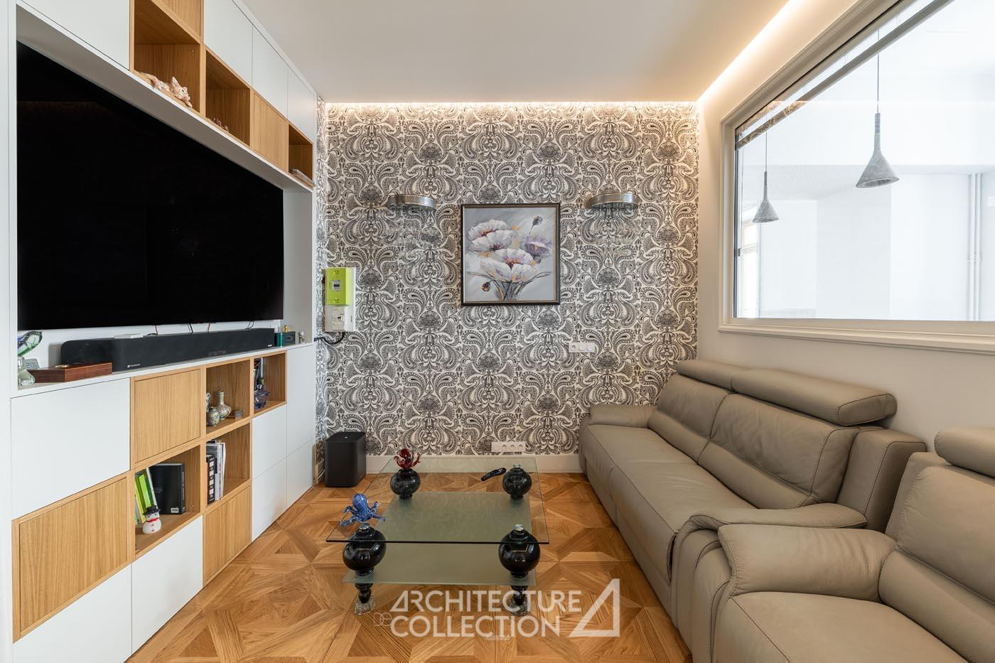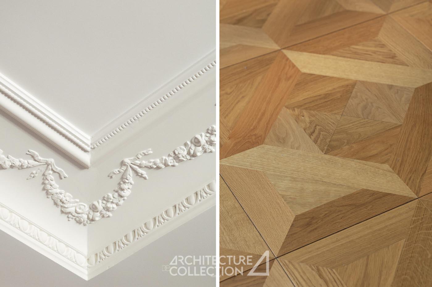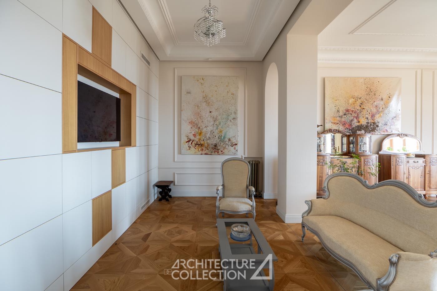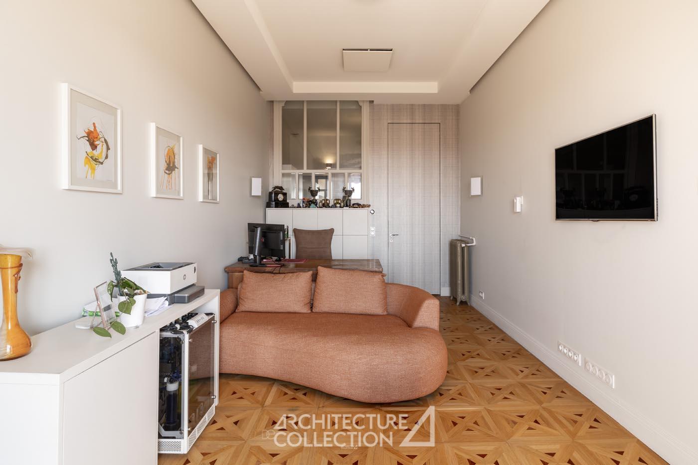 Au sol, un parquet en chêne, interprétation du motif moderne Versailles, confère aux volumes une élégance classique subtilement réinventée, en dialogue avec une rénovation où chaque élément a été choisi pour sa pérennité et sa justesse.
