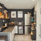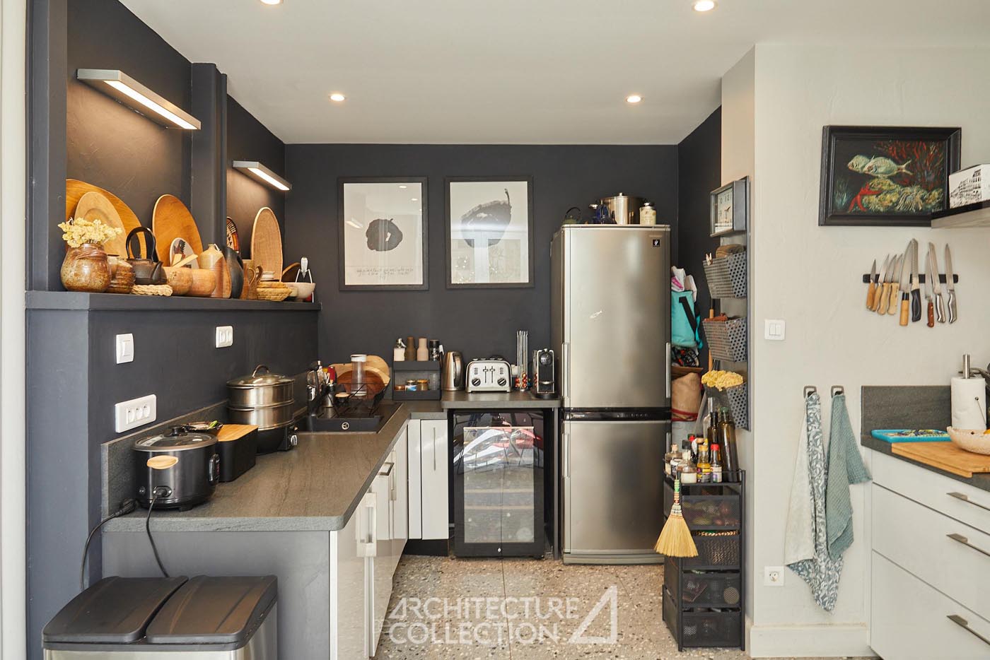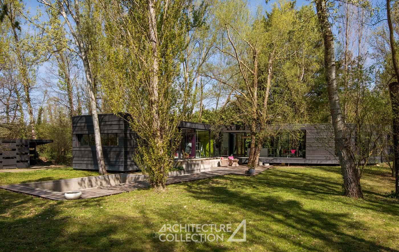 Le deuxième niveau accueille un atelier/bureau, deux chambres, une salle d’eau, des toilettes séparées, un dressing et une buanderie. La mezzanine, ouverte sur les espaces de vie, offre des vues plongeantes de part et d’autre sur le séjour et la salle à manger. Ces jeux de volumes, associés aux verrières, permettent à ces espaces en second jour de bénéficier d’une belle luminosité.