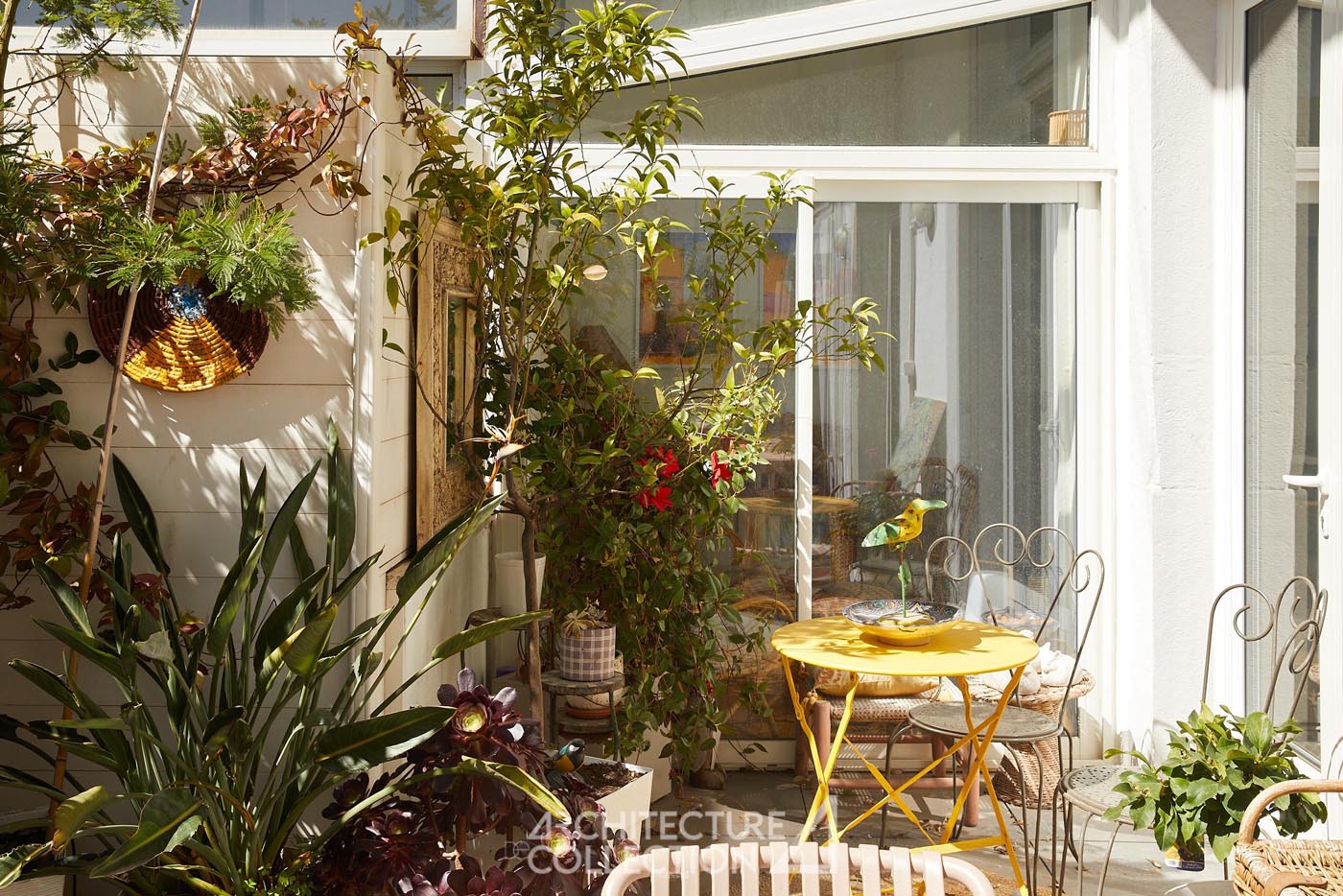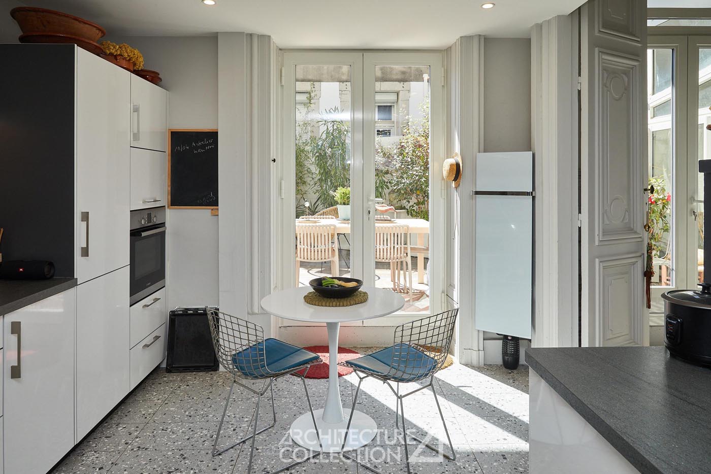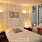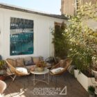L’ensemble du rez-de-chaussée communique visuellement par le biais de verrières, favorisant la circulation de la lumière et renforçant la sensation d’espace. Elles donnent accès à une terrasse de 25m², à l’abri des regards, ainsi qu’à la mezzanine.