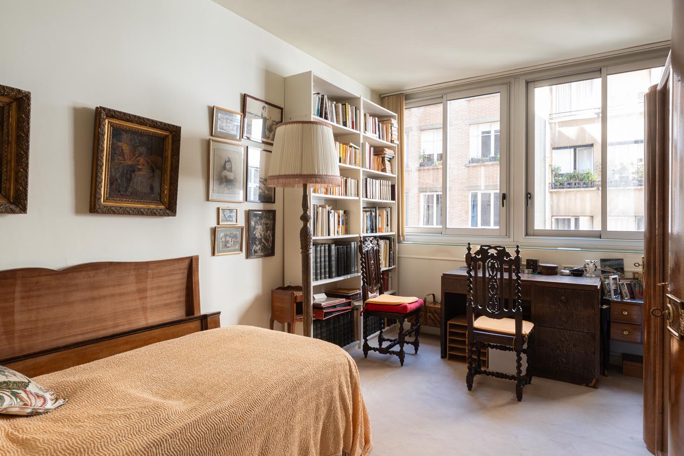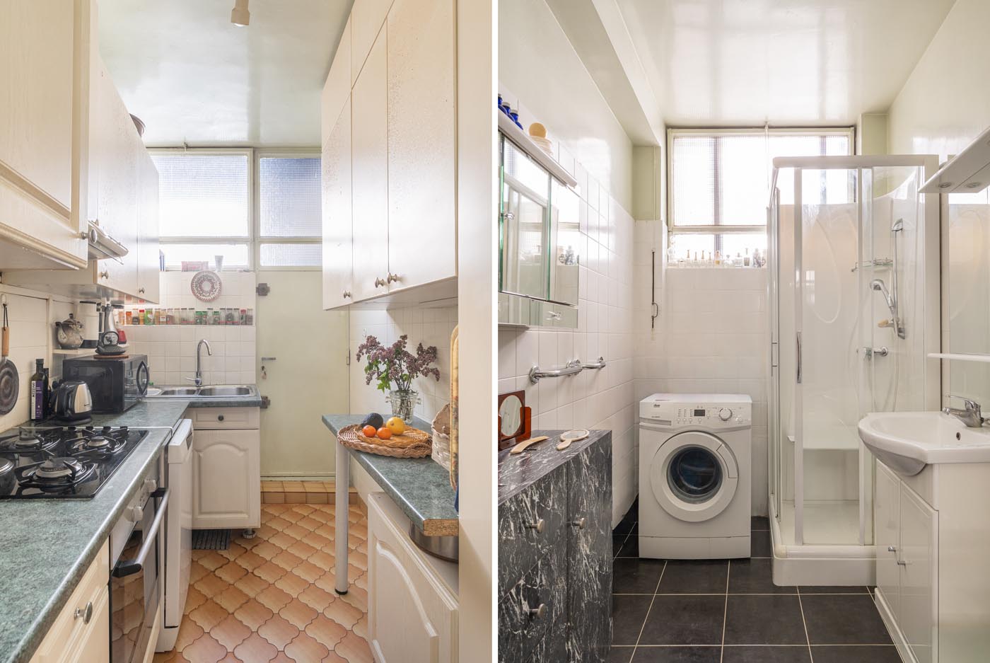 Il comprend une entrée, un salon et une salle à manger de près de 40 m², une cuisine indépendante équipée avec accès de service. L’appartement dispose également d’une chambre de 13 m² donnant sur cour et d’une salle de douche avec toilettes.