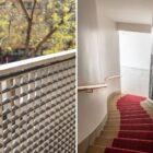 L’habituel angle en rotonde prend ici la forme d’un cylindre lisse, percé de verrières horizontales et surmonté d’une terrasse végétalisée. De part et d’autre de ce cylindre, les deux façades présentent une géométrie inversée. L’une affecte une volumétrie pleine et massive, ponctuée de fenêtres en bandeau, tandis que l’autre, aérienne, est largement évidée grâce aux balcons filants des appartements.