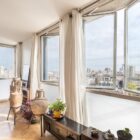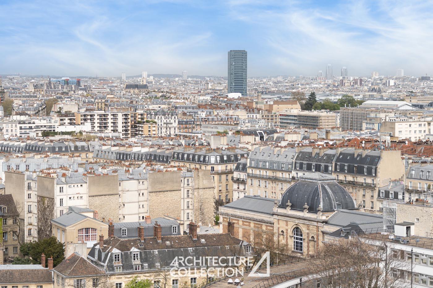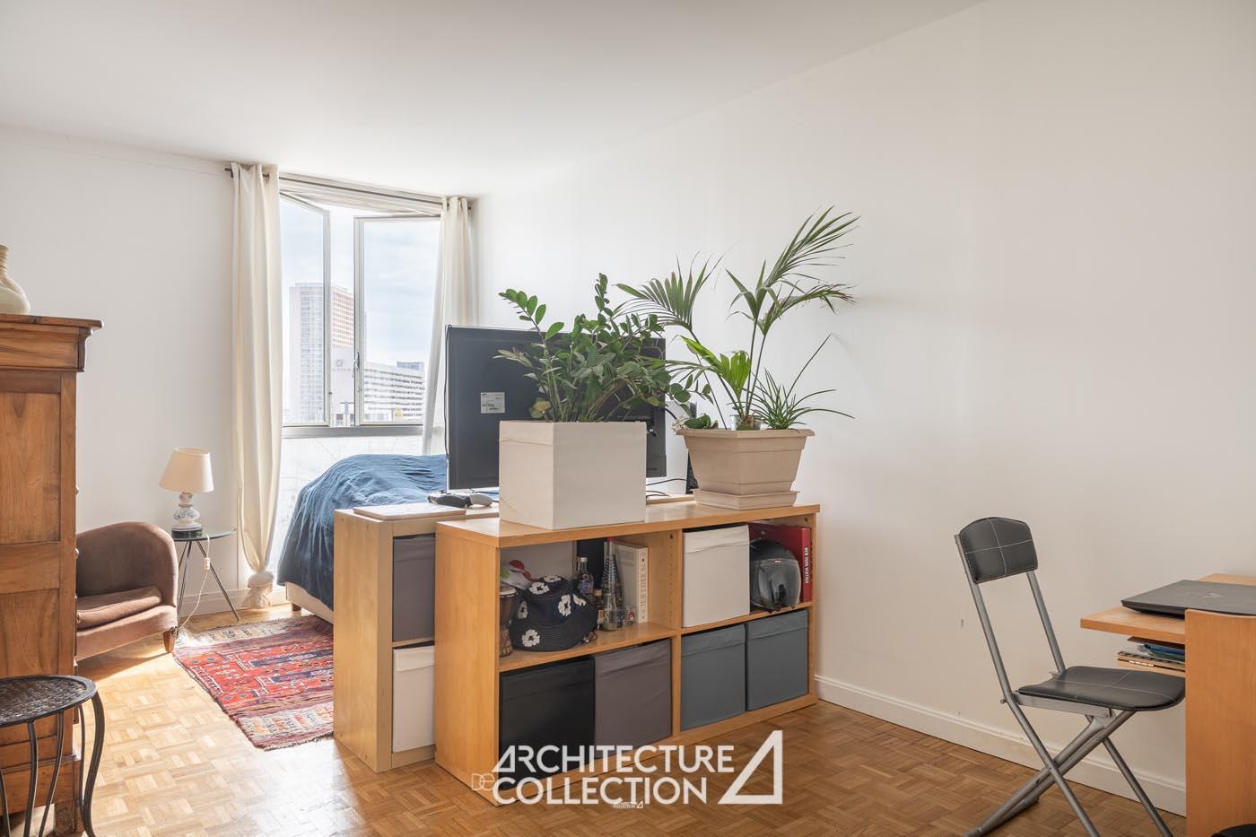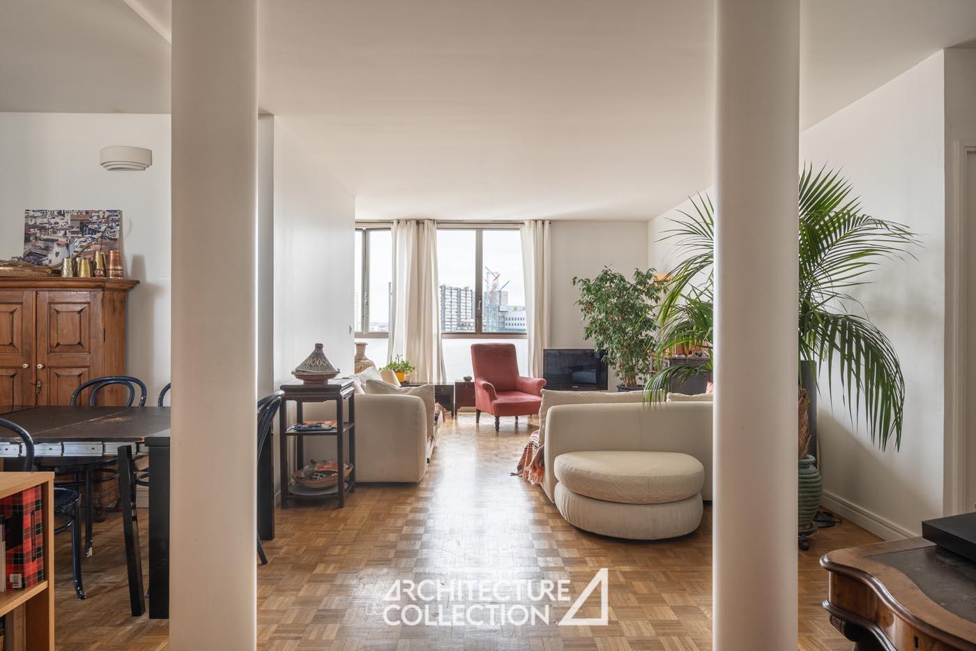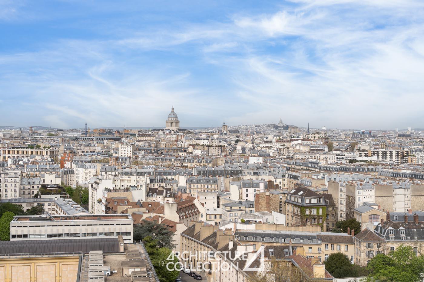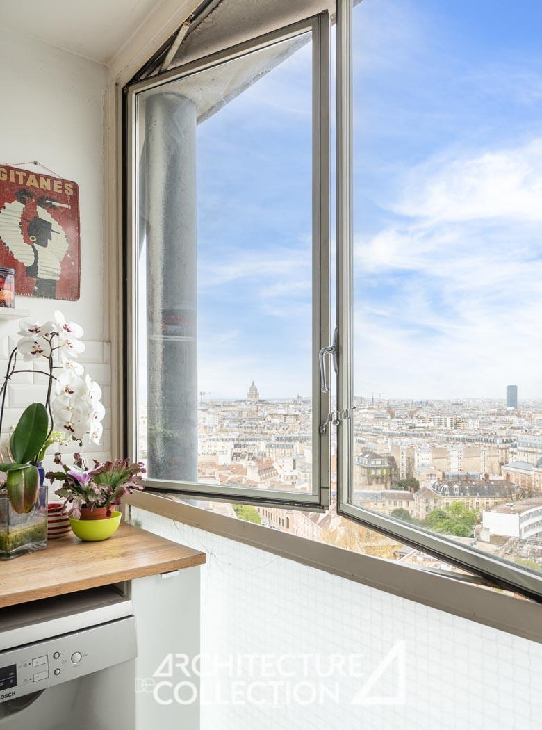 Tout en transparence, l’appartement est baigné de lumière grâce sa double exposition nord-est et ses nombreuses ouvertures toute hauteur. Ces dernières offrent une vue imprenable sur Paris et ses monuments tels que le Sacré Cœur, la Cathédrale Notre-Dame, Panthéon, la place d’Italie et les tours du 13e arrondissement.