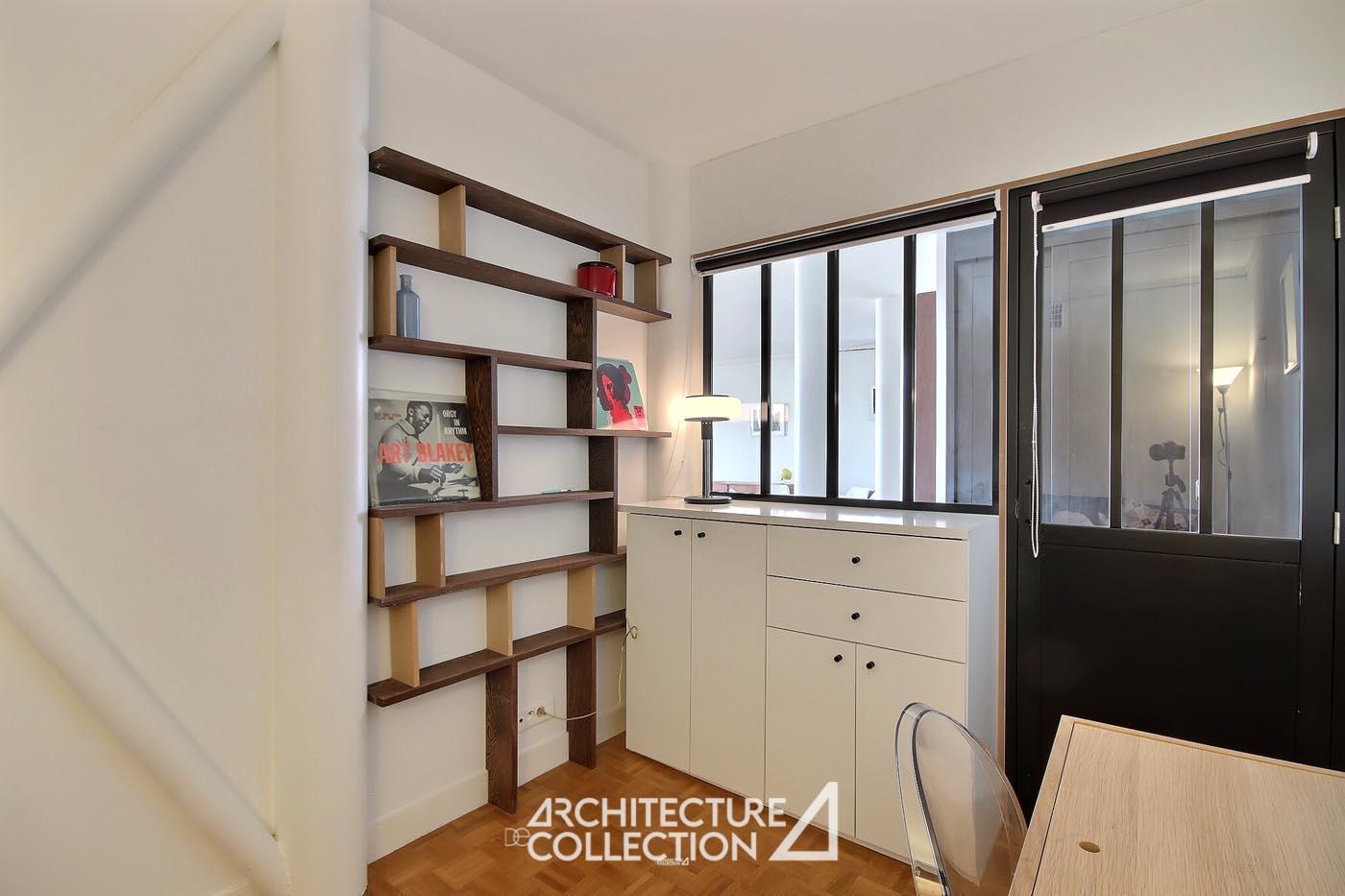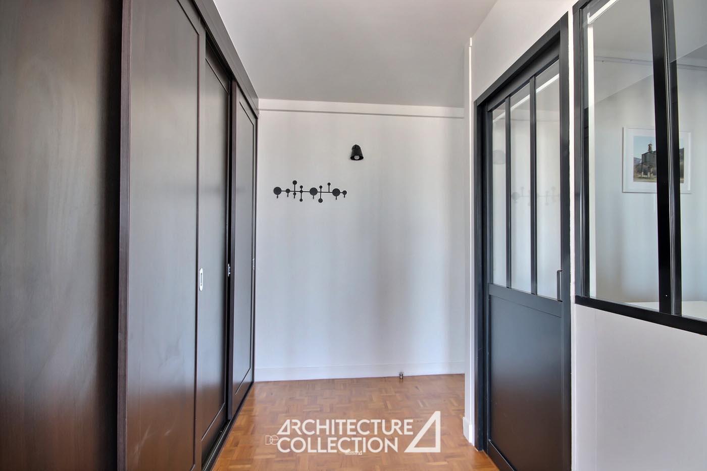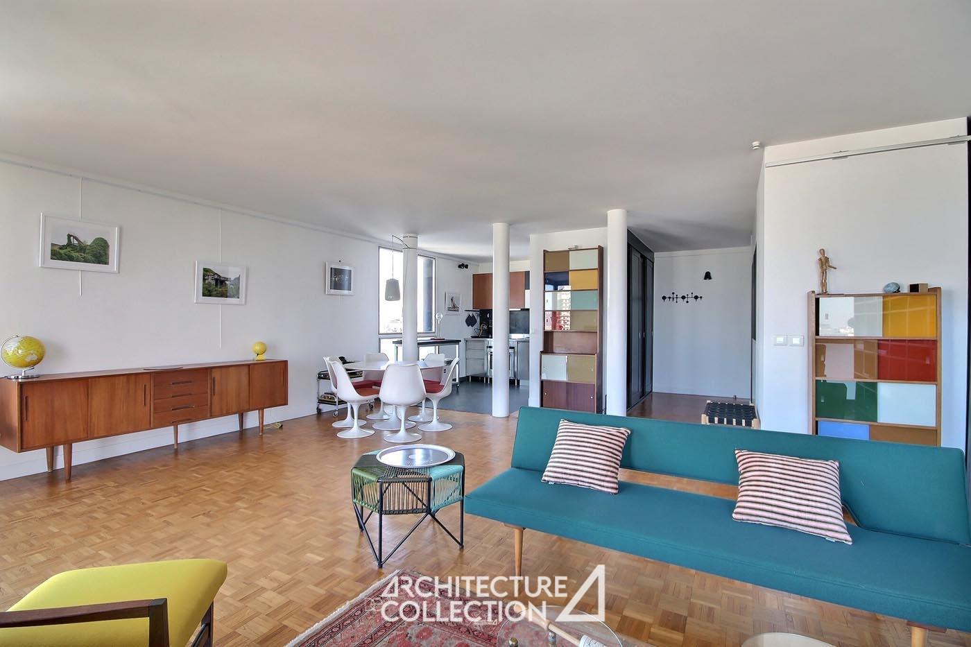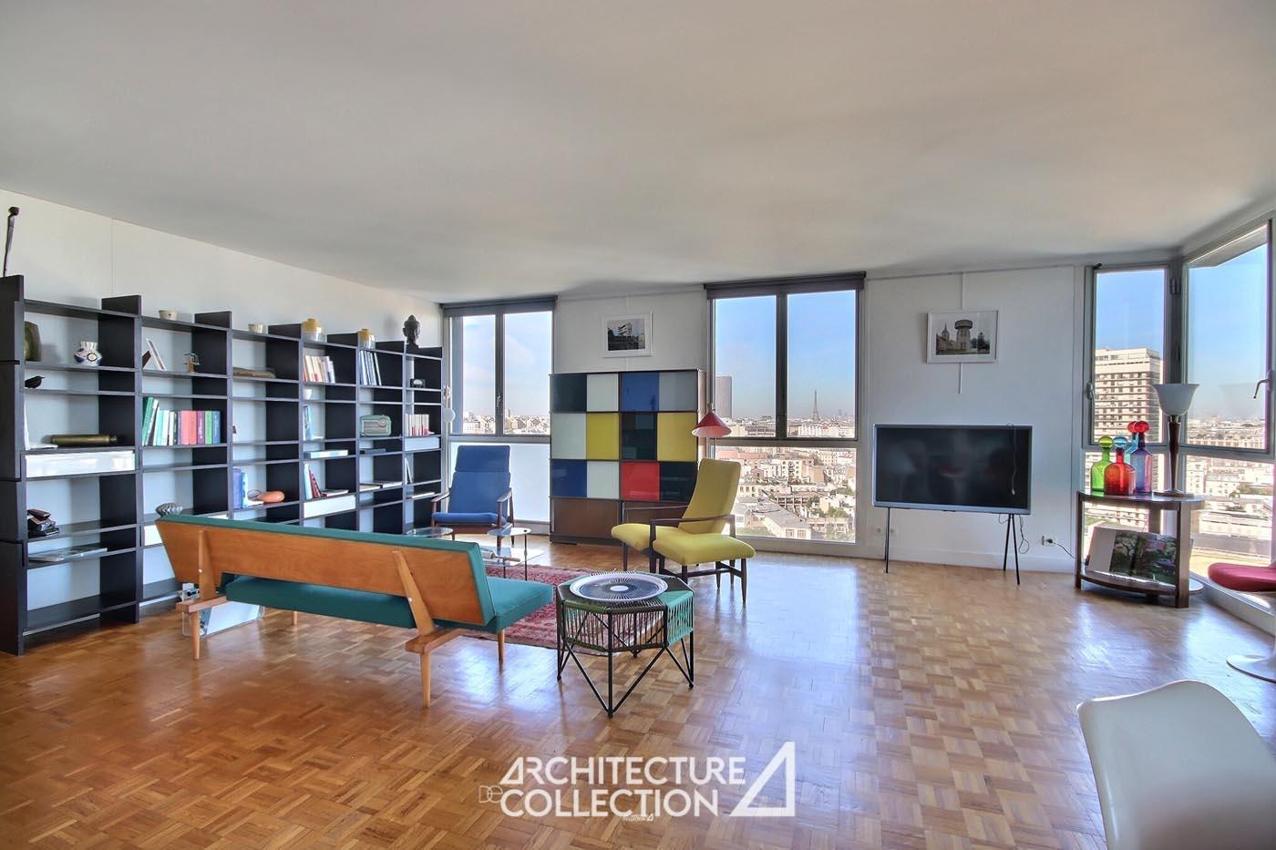 Tout en transparence, l’appartement est baigné de lumière. Il offre des vues panoramiques exceptionnelles sur tous les monuments de Paris : la Tour Eiffel, les Invalides, le Sacré Cœur, la Cathédrale Notre-Dame, le Panthéon, etc.