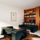 La bibliothèque en contreplaqué, pièce maîtresse de l’espace de vie, se décline aussi en buffet et en espace de travail. Grâce à une porte pivotante à 180 degrés, elle s’ouvre sur le salon et permet de dissimuler le bureau lorsqu’il n’est pas utilisé.