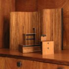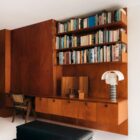 La bibliothèque en contreplaqué, pièce maîtresse de l’espace de vie, se décline aussi en buffet et en espace de travail. Grâce à une porte pivotante à 180 degrés, elle s’ouvre sur le salon et permet de dissimuler le bureau lorsqu’il n’est pas utilisé.