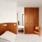 Parmi les matériaux utilisés, le contreplaqué occupe une place centrale, comme dans la plupart des projets de l’architecte. Sa teinte, inspirée des huisseries existantes, structure les volumes et assure une continuité visuelle entre le salon, le couloir et les chambres.