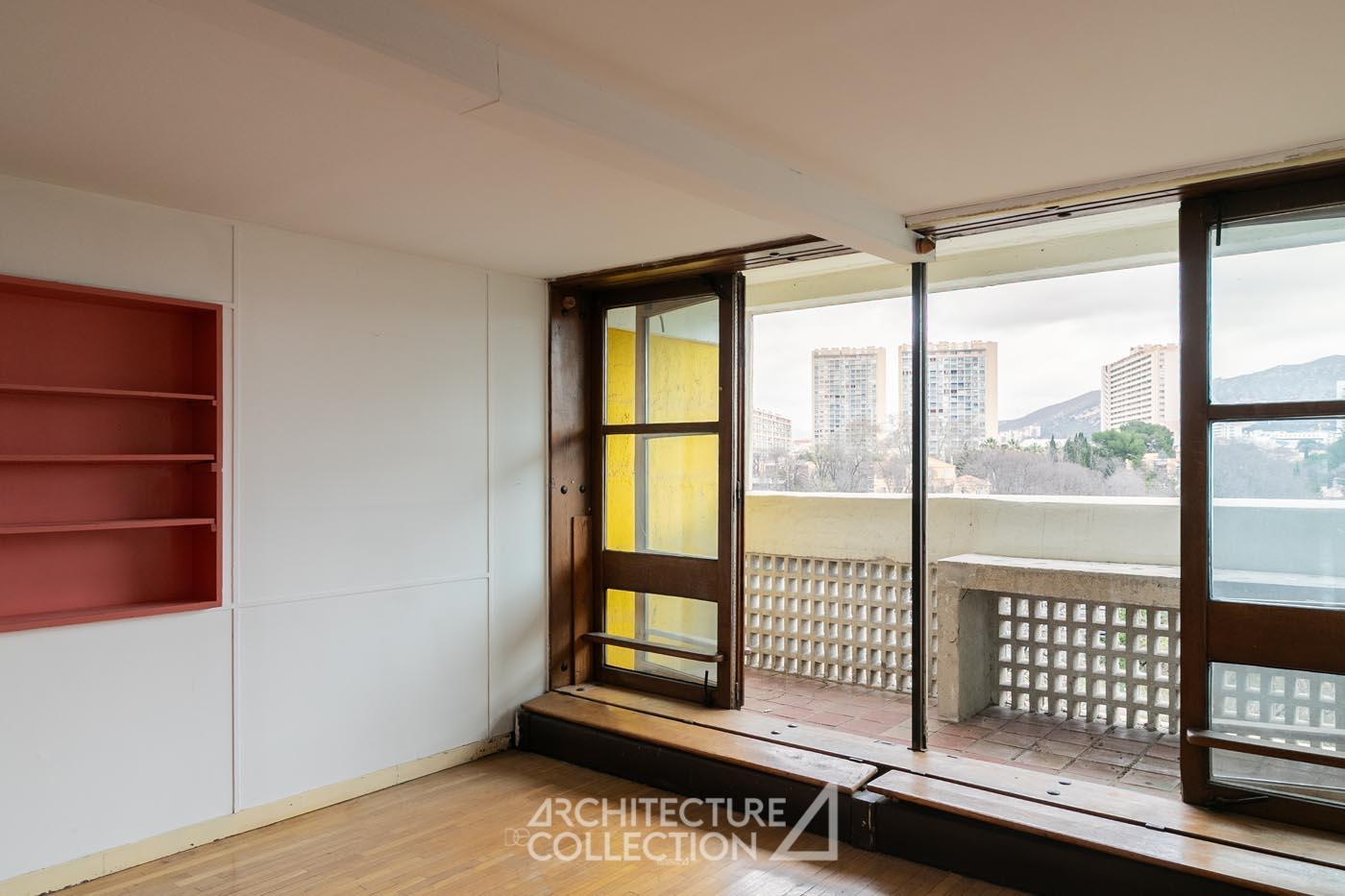 L’appartement a été réaménagé et offre un espace vaste de vie, aménageable en chambre, en double hauteur et baigné de lumière. Celui-ci se prolonge par une loggia de 8 m², conçue comme une extension du séjour et offrant une vue exceptionnelle sur la ville de Marseille et ses collines.