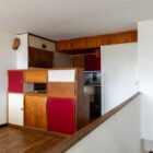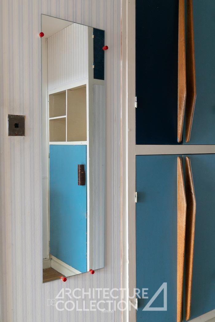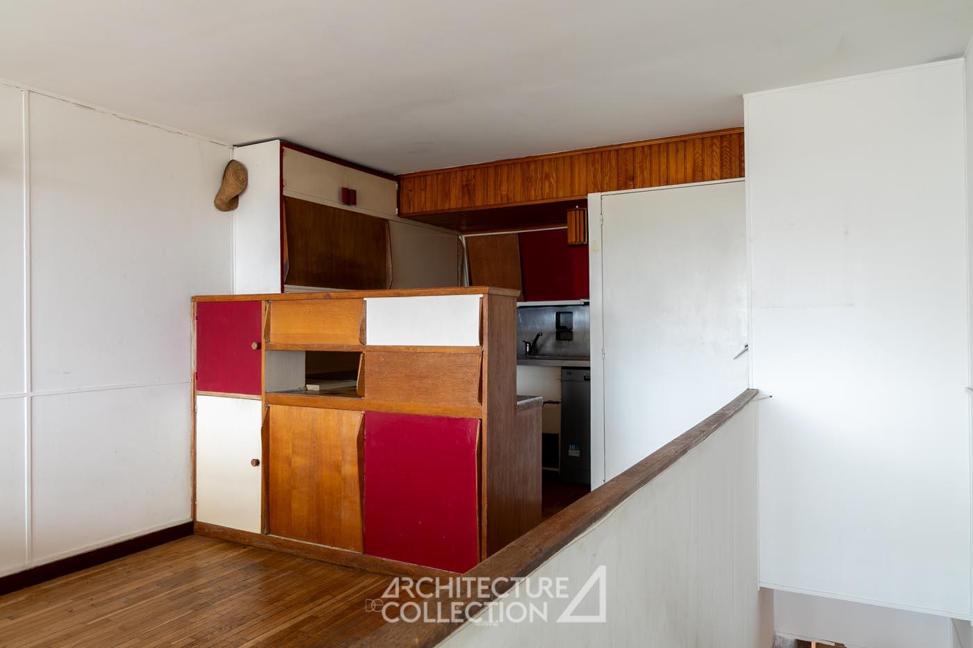 D’une superficie d’environ 5 m², cette cuisine de plan carré s’intègre à la salle à manger/séjour grâce à son bar. Elle est équipée du confort moderne de l’époque : cuisinière électrique, vide-ordures, armoires frigorifiques et de nombreux rangements. Présentée au Salon des arts ménagers en 1950, elle incarne un équilibre entre innovation et pragmatisme.