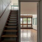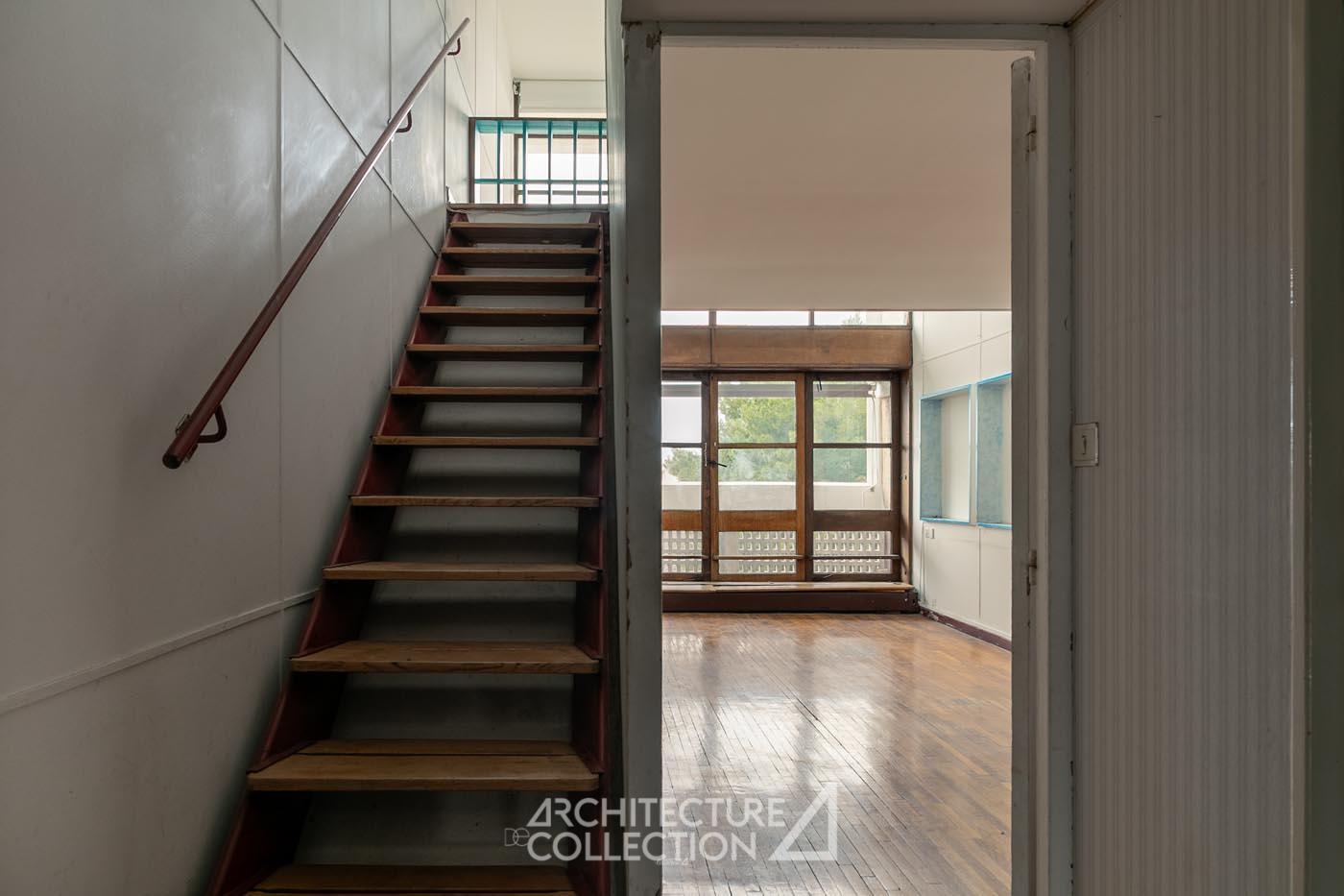 L’escalier intérieur, conçu par Jean Prouvé, présente une structure métallique légère et des marches en chêne massif évoquant une échelle de coupé de bateau.