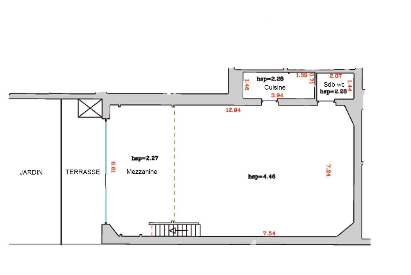 Une mezzanine de 23 m² peut composer une chambre parentale ou un bureau. Elle est facilement démontable, et tout le plateau du rez-de-jardin peut alors profiter d’une hauteur sous plafond de près de 5m, parfaitement isolée phoniquement du fait de son ancienne activité musicale.