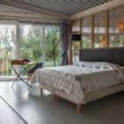Citoula & Raulet architectes dessinent un bâti tout en longueur, à la façade convexe largement vitrée permettant de maximiser les vues sur l’extérieur. Le travail sur la circulation de la lumière et les effets de transparences est ici remarquable, la dimension traversante de la maison renforçant cet effet. Jusque dans la distribution des espaces la fluidité de circulation est manifeste : que ce soit la chambre dans le salon, véritable espace intime en plein cœur de la maison et simplement séparable par un rideau ou encore les vitres de la salle de bain, fermées par des stores.