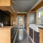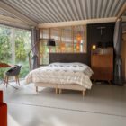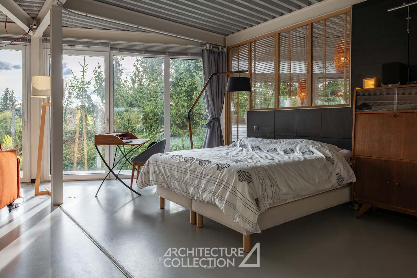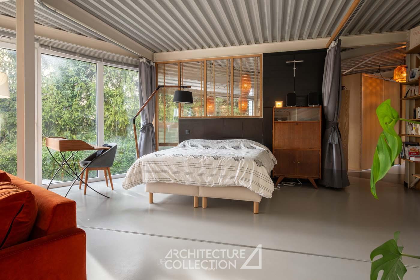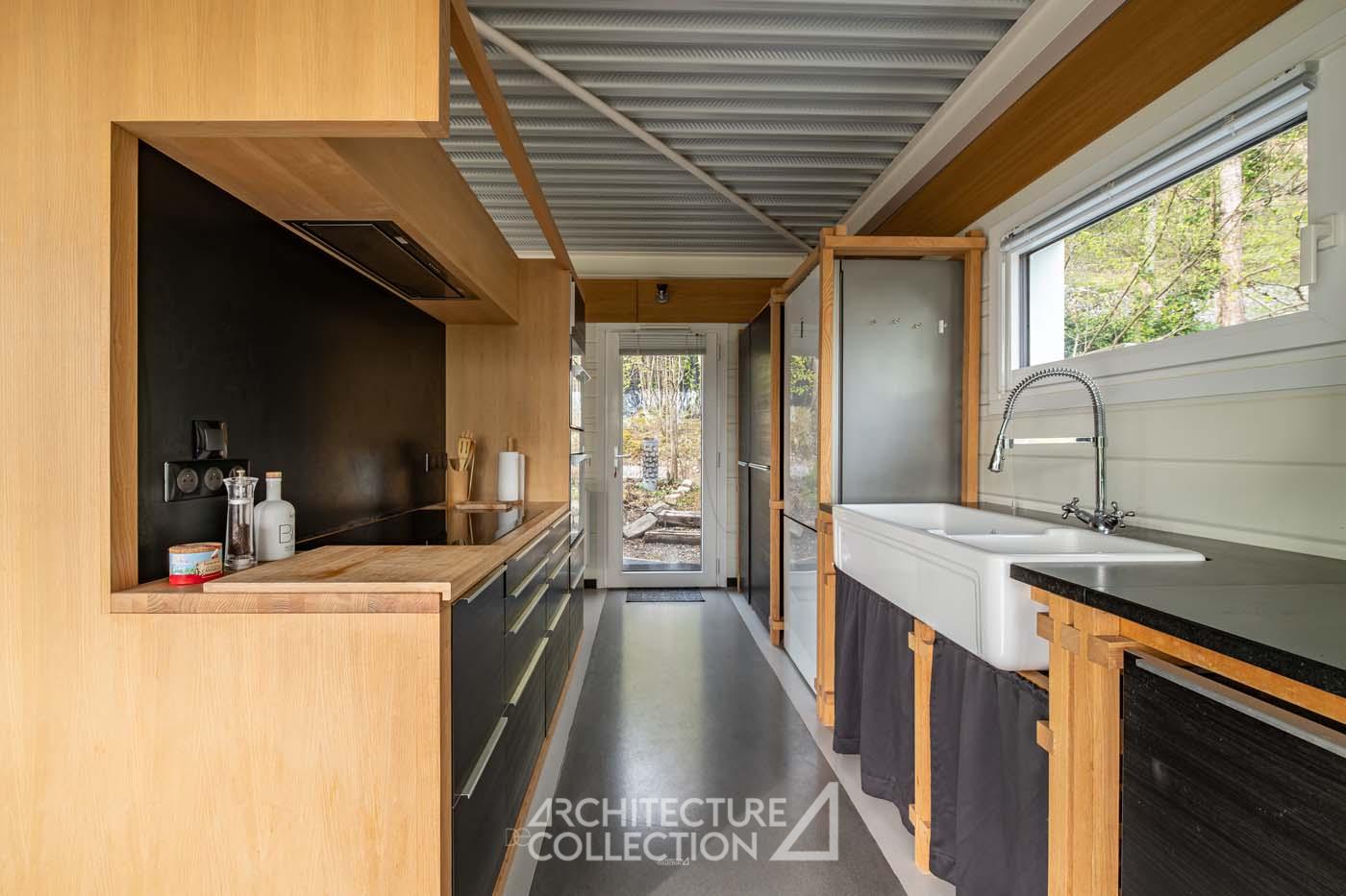Sur un niveau, cette maison déploie tout d’abord une grande pièce décloisonnée accueillant un salon avec poêle à bois électronique, une salle à manger, une cuisine ouverte toute équipée ainsi qu’un coin modulable et séparé par un rail de rideau pouvant faire office de chambre. Cet espace traversant de 80 m² est largement baigné de lumière grâce aux nombreuses baies vitrées.
