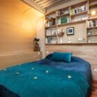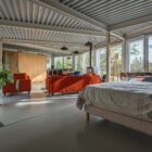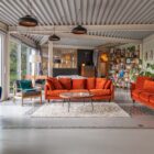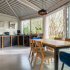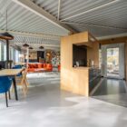 Cette circulation, des usagers et de la lumière, est facilitée par les nombreuses ouvertures mais aussi le choix d’un plateau libre qui reprend les caractéristiques des lofts. Les matériaux industriels (béton ciré, poutres métalliques, bac acier ondulé) se mettent ici au service de l’espace, permettant un large décloisonnement et de nombreux percements. D’autant plus que les ondulations des tôles du toit créent un effet graphique qui amène de la profondeur et de l’espace dans la maison.