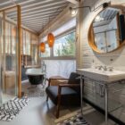 La maison abrite une chambre de 13 m² avec rangements intégrés, une salle de bain avec baignoire et douche à l’italienne ainsi qu’une double vasque, des wc séparés et des rangements supplémentaires.